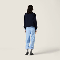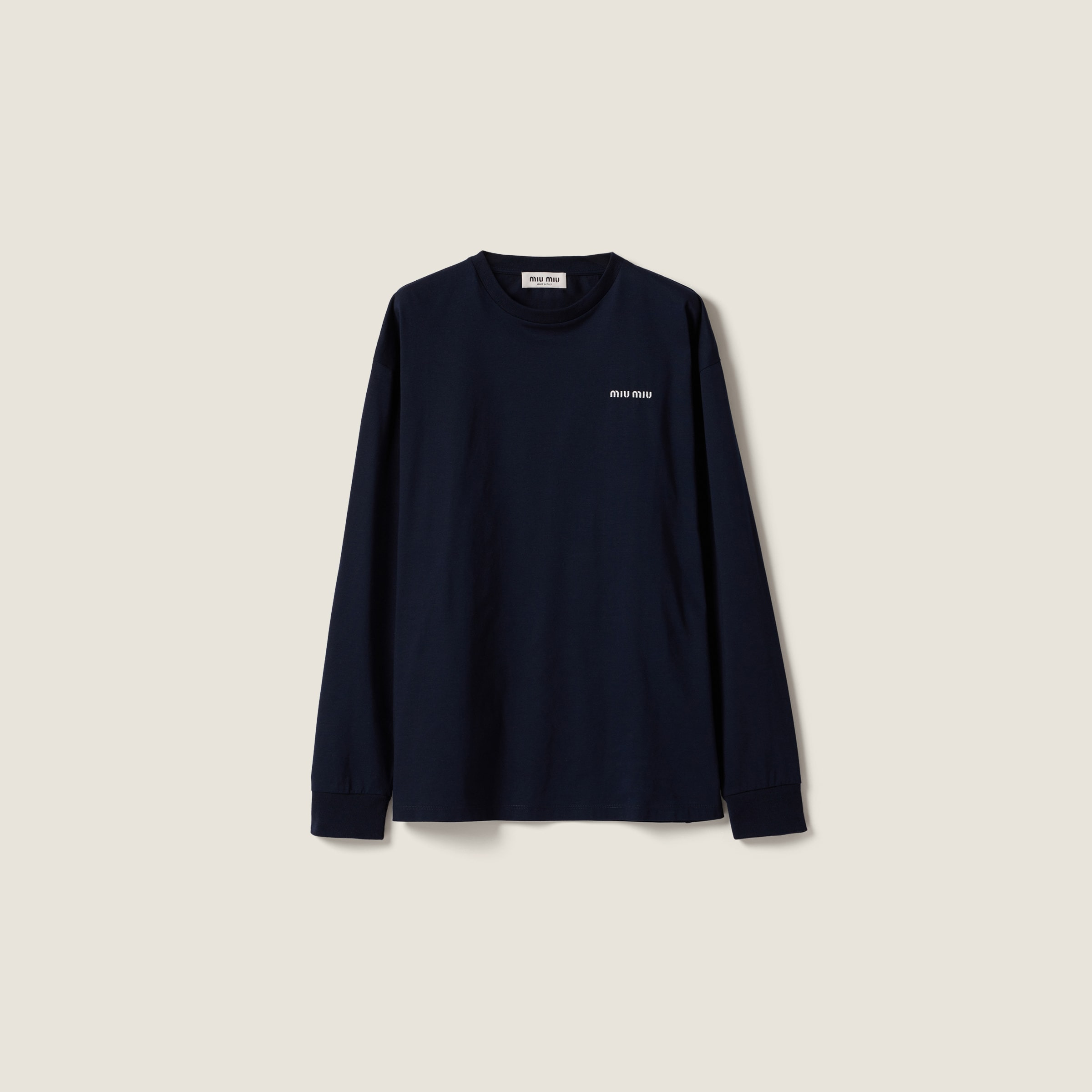 Jersey, an emblematic fabric in the Miu Miu wardrobe, reinterprets the character of this long-sleeve tee through the garment-dyeing process that enhances its relaxed versatility and contemporary femininity. - Product code: MJL087_1610_F0008_S_OOO - Oversized fit - Unlined garment - Long sleeves with ribbed knit cuffs - Crew-neck - Side slits - Straight hem - Embroidered logo - Imported - The model is 180 cm tall and wears a size 38 Height 64cm Materials Main material: 100% Cotton