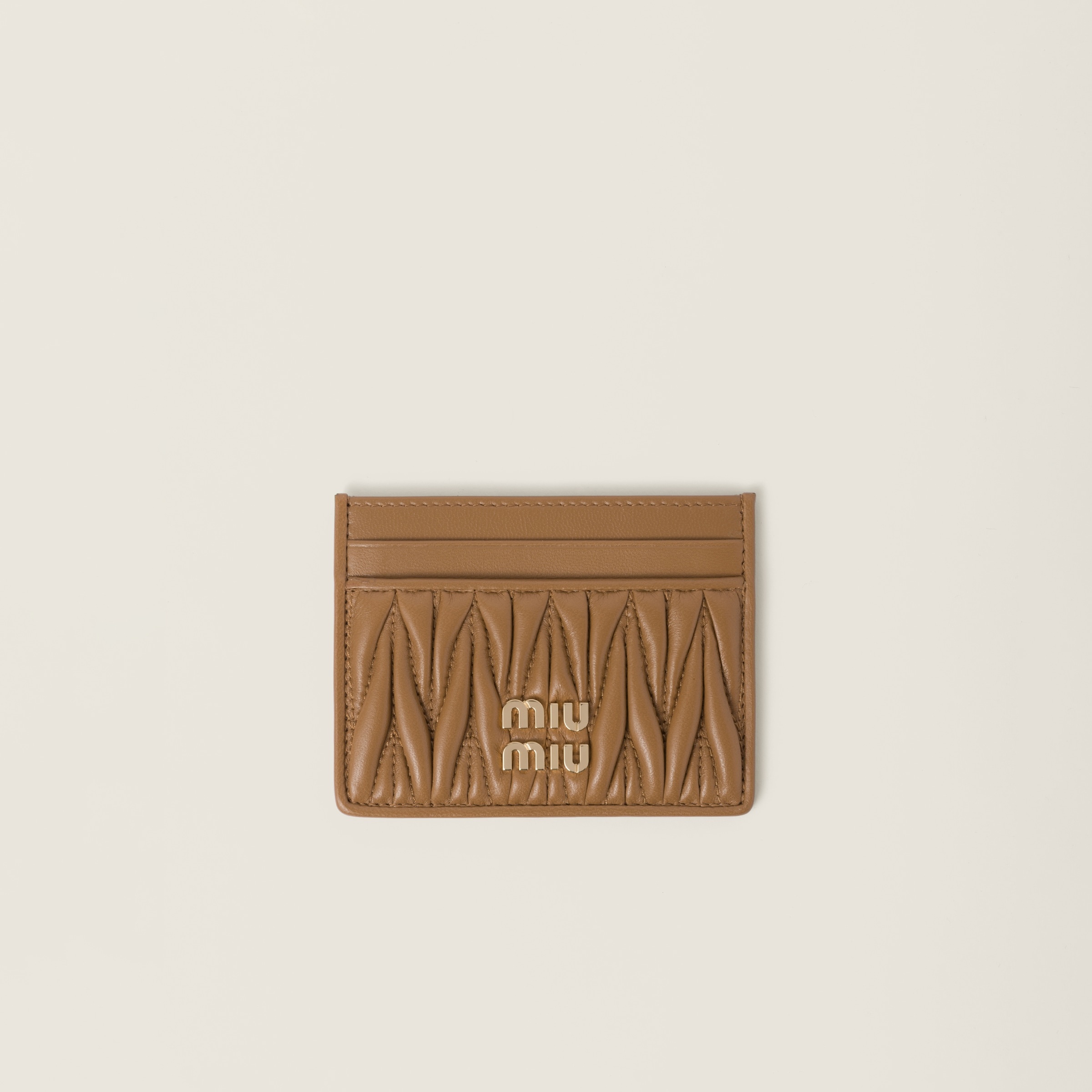 This compact accessory blending form and function is enhanced by the matelasse workmanship of the leather. Equipped with card slots, it is decorated by the vertical metal lettering logo. - Product code: 5MC076_AFPP_F098L - Matelasse motif - Metal lettering logo - Six card slots - Moire lining - Imported Height 8cm Width 10.5cm Materials Main material: Lambskin