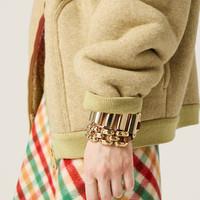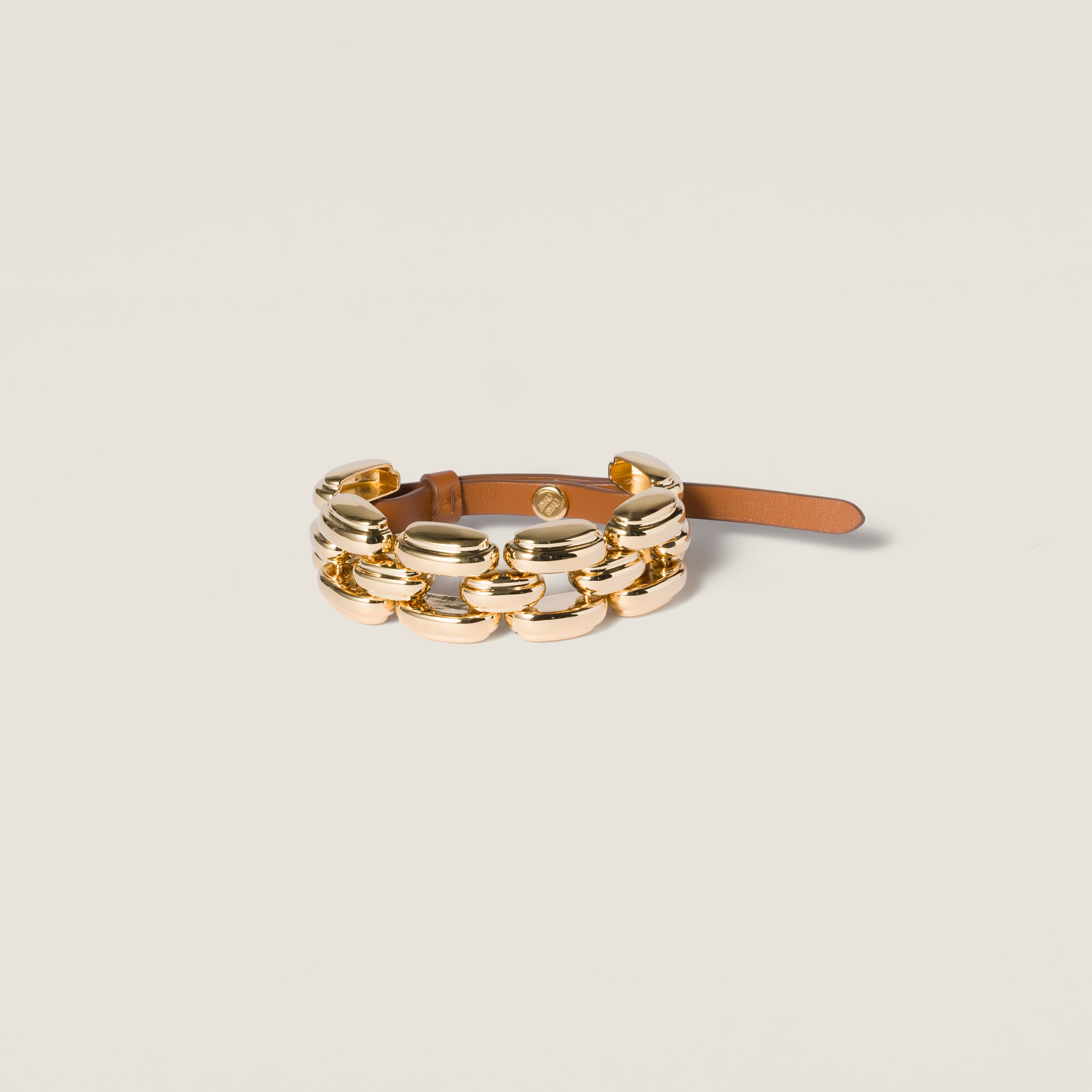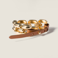Inspired by the belts of the SS25 fashion show, this bracelet combines the lustrous shine of its gold elements with the sophistication of soft leather, elevating simple looks through bold layering and contrasts. - Product code: 5IB704_2IEQ_F0C1U - Cufflink clasp - Adjustable length - Visible engraved logo - Imported Height 2.3cm Materials Main material: Calfskin