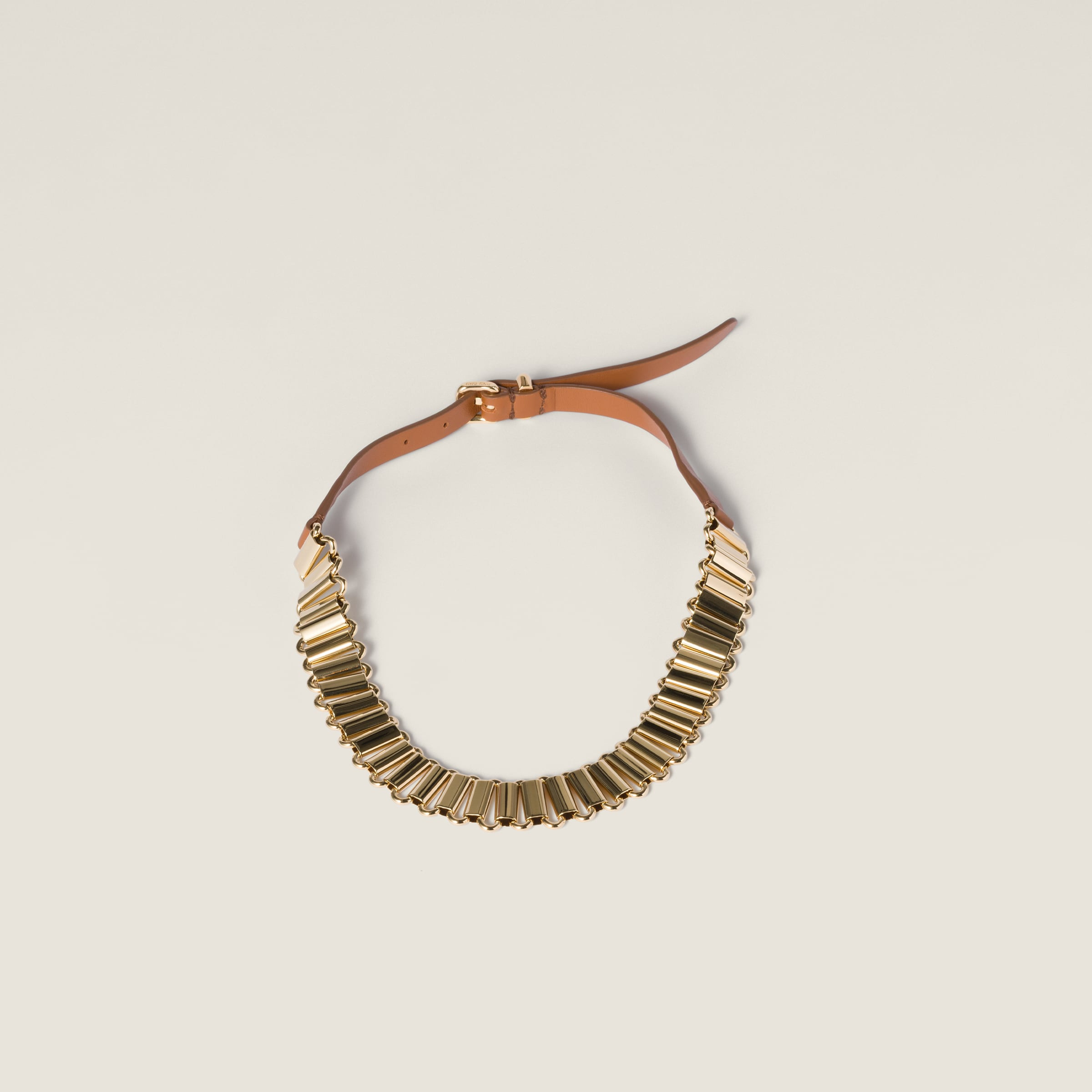 Inspired by the belts of the SS25 fashion show, this necklace combines the lustrous shine of its gold elements with the sophistication of soft leather, elevating simple looks through bold layering and contrasts, an emblem of Miu Miu's versatile femininity. - Product code: 5IC243_2IEQ_F0C1U - Metal buckle closure - Logo-engraved loop - Imported Materials Main material: Calfskin