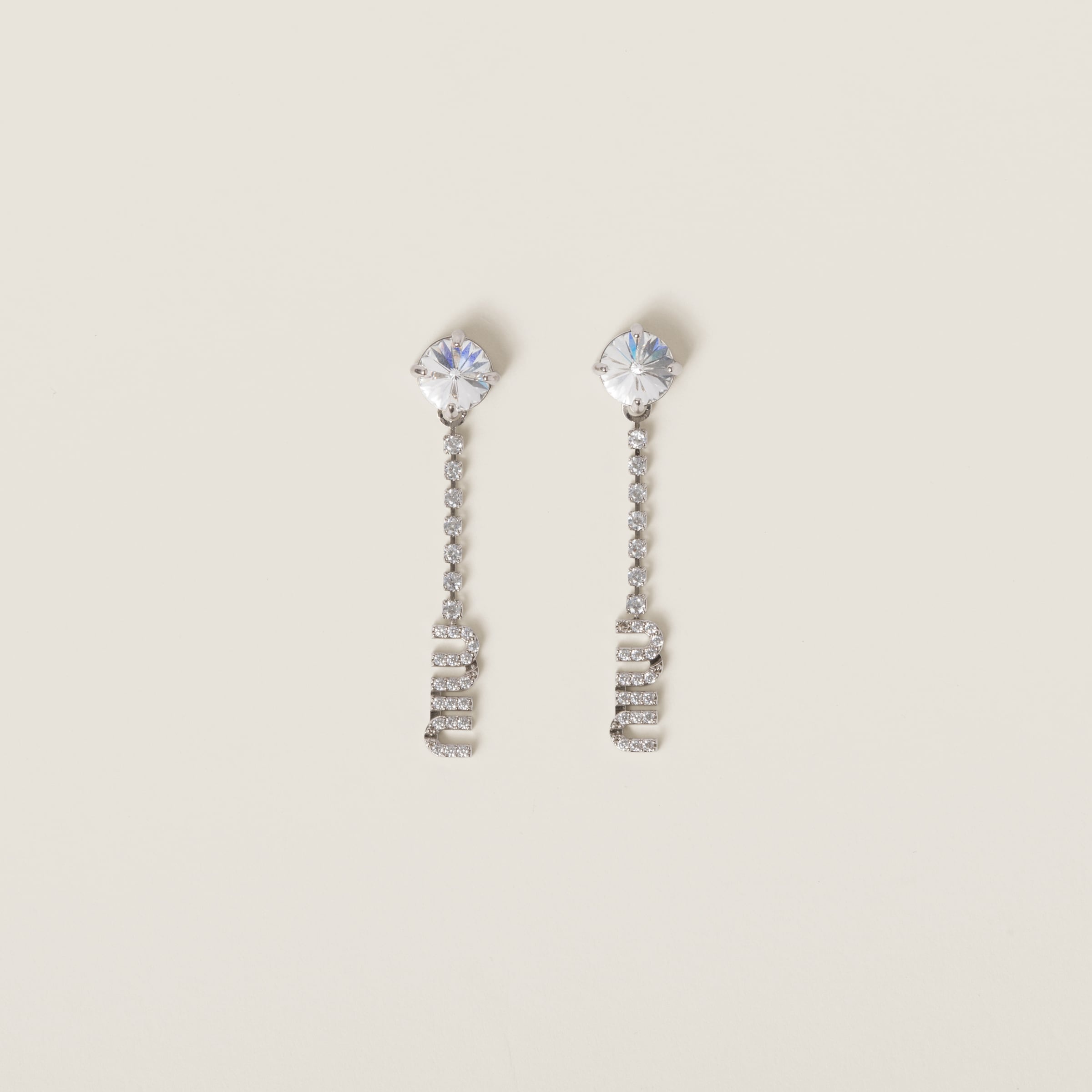 Miu Miu reinvents the classic dangle earring with its iconic logo and whimsical femininity. Artificial crystals add delicate shimmering touches that complete the piece with a refined note. - Product code: 5IO058_2DNC_F0OKL - For pierced ears - Visible logo - Artificial crystals - Imported Height 4.5cm Width 0.9cm Length 1.7cm Materials Other materials