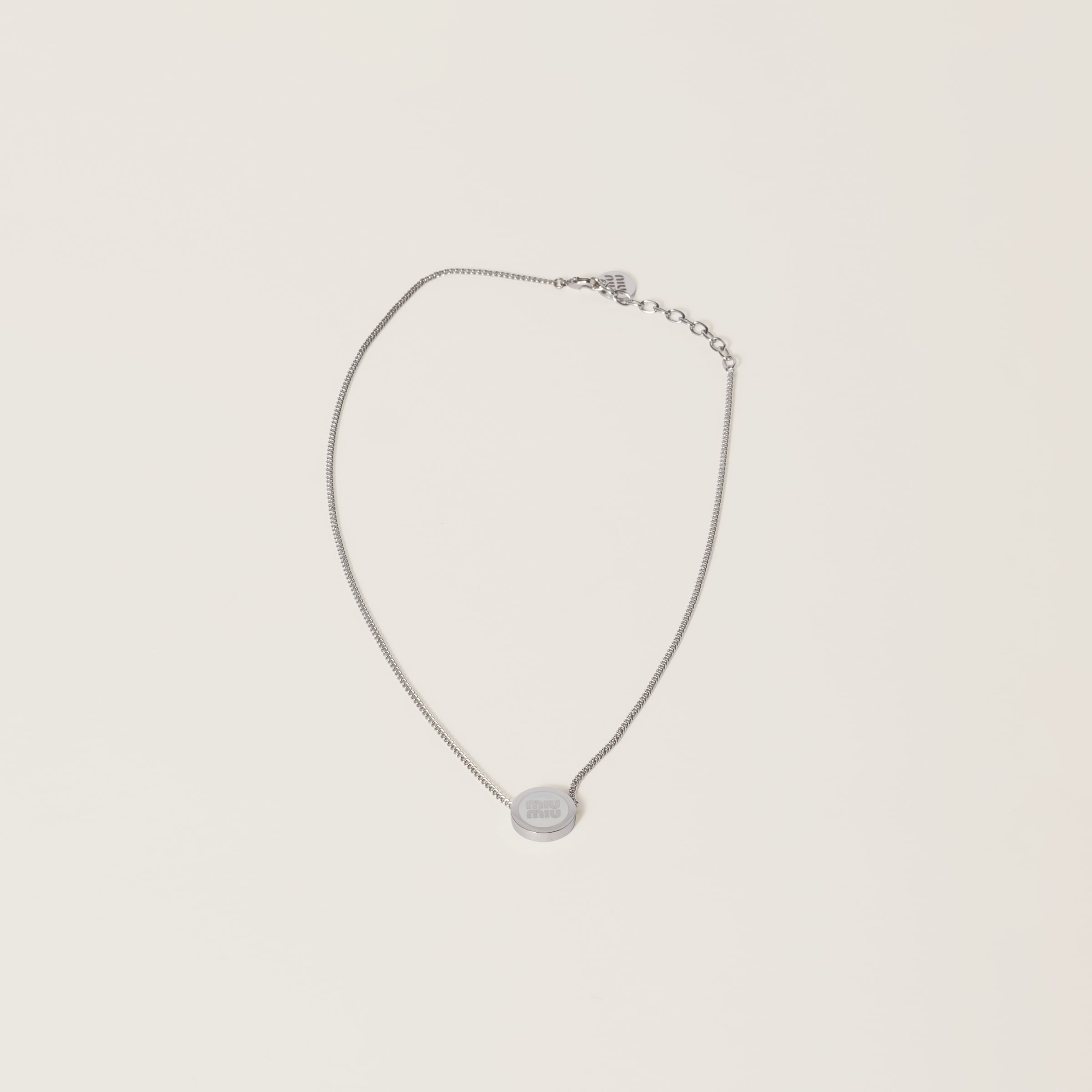 The Miu Miu logo stands out on the sleek lines of this metal necklace, thanks to its iconic character. - Product code: 5IC096_2F6T_F097W - With enameled detail - Lobster claw clasp - Visible logo - Imported Width 48cm Materials Main material: Brass