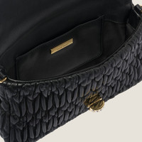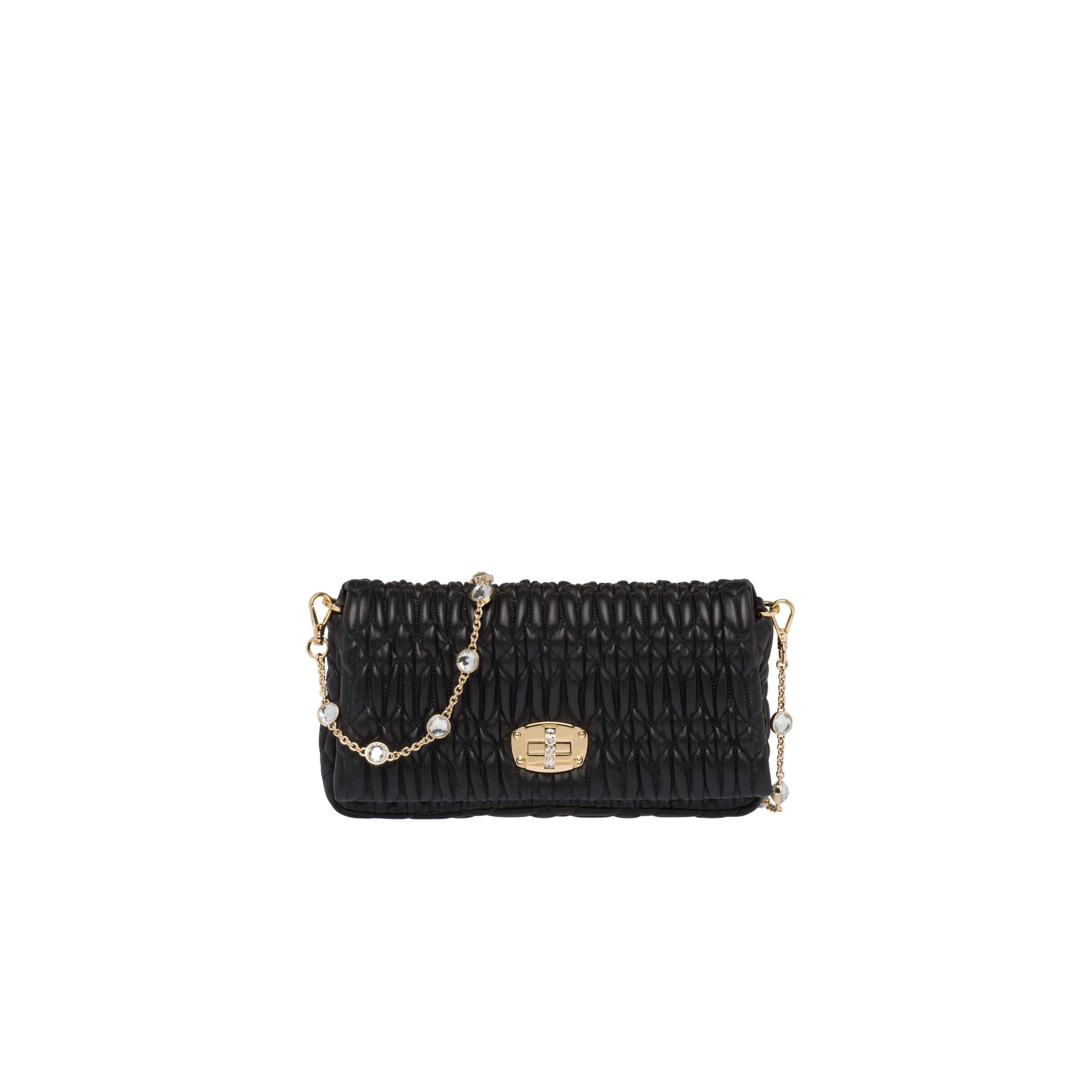 The iconic Cloquet motif distinguishes the design of the Miu Crystal bag, here with double shoulder strap: with crystals and woven nappa leather. $ The accessory is illuminated by the crystal-studded clasp. - Product code: 5BD417_FVJ_F0002_V_COG - Cloque nappa leather - Detachable 110 cm crystal strudded metal shoulder strap - Detachable 30 cm braided nappa leather shoulder strap - Metal lettering logo - Crystal studded turn-lock clasp - Satin lining - Inside zipper pocket - Imported Height 12.5cm Width 22.5cm Length 4.5cm Materials Main material: Lambskin