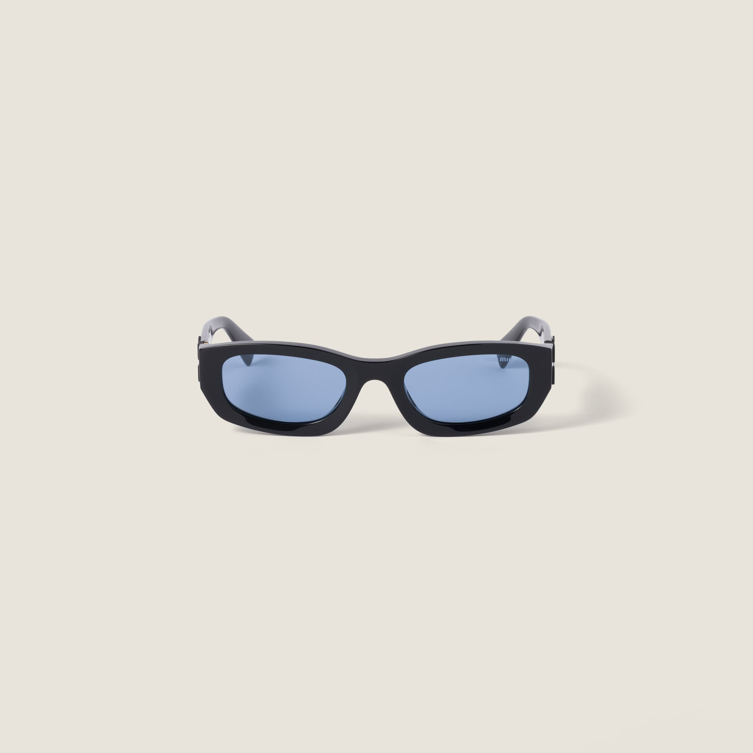 The Miu Glimpse sunglasses reinterpret the collection’s stylistic codes with low-set shapes and streamlined profiles. The rectangular acetate frame is highlighted by the vertical Miu Miu logo integrated into the hinge of the thick temples. - Product code: SMUB04_E16K_FE30U_C_053 - Acetate frame front - recycled black color - Frame compatible with graduated lenses - 100% UVA/UVB protection - Standard Fit - Lens-nose-temple measurement: 53-22-135 mm - Article comes with dedicated packaging - Imported Materials Main material: Acetate