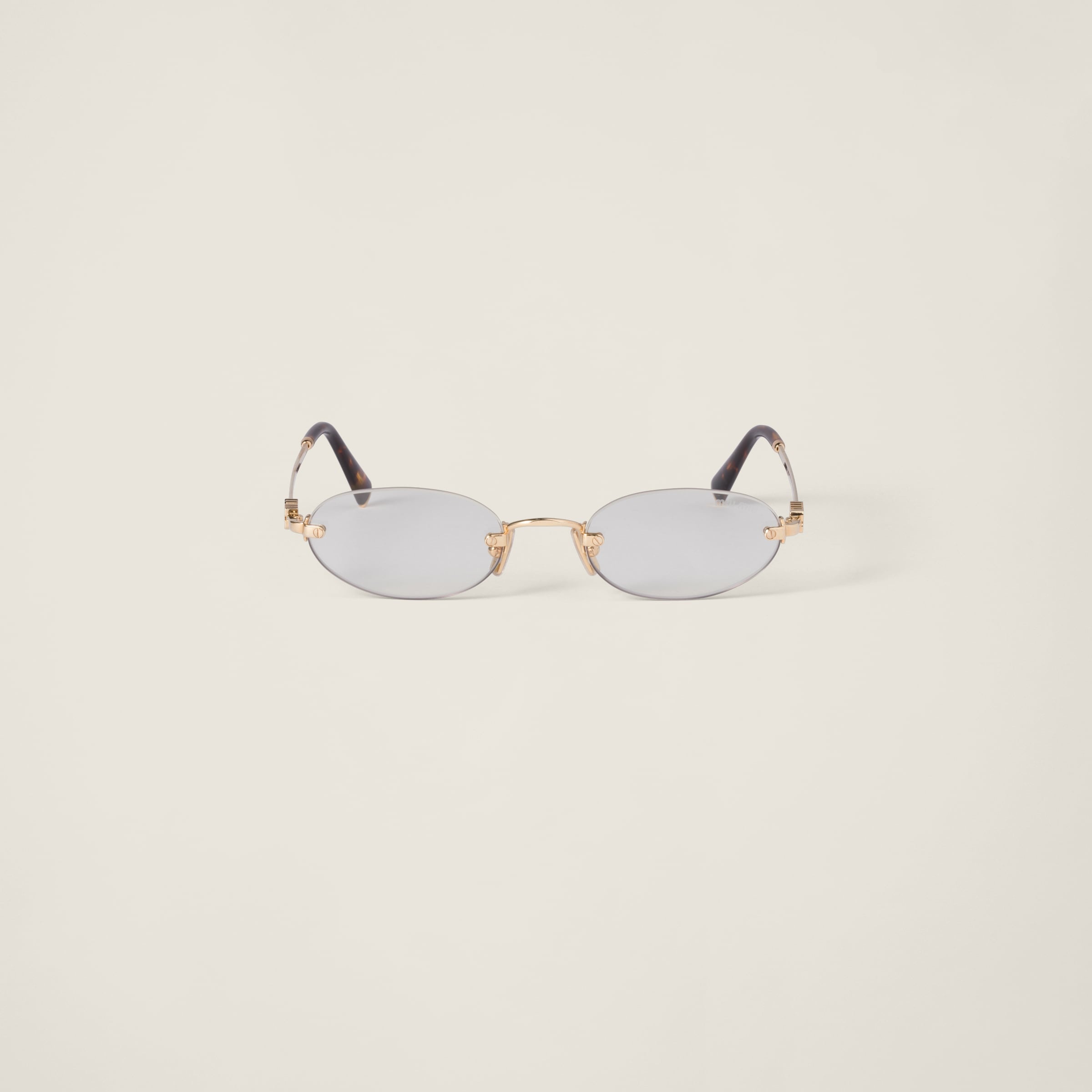 Classic and sophisticated attitudes blend together in these Miu Miu sunglasses. The ultra-light metal frame features rimless oval lenses enriched by a palette of playful shades. The vertical Miu Miu logo decorates the ultra-thin temples. - Product code: SMUA54_S5AK_FE08N_C_051 - Metal frame front - Color: Gold - Frame compatible with graduated lenses - 100% UVA / UVB protection - Blue Light lenses without prescription have a special filter to reduce exposure to the blue light of digital devices and sunlight. - Adjustable nose pads adaptable to each fit - Lens-nose-temple measurement: 51-20-140 mm - Article comes with dedicated packaging - Other colors available - Imported Materials Main material: Metal