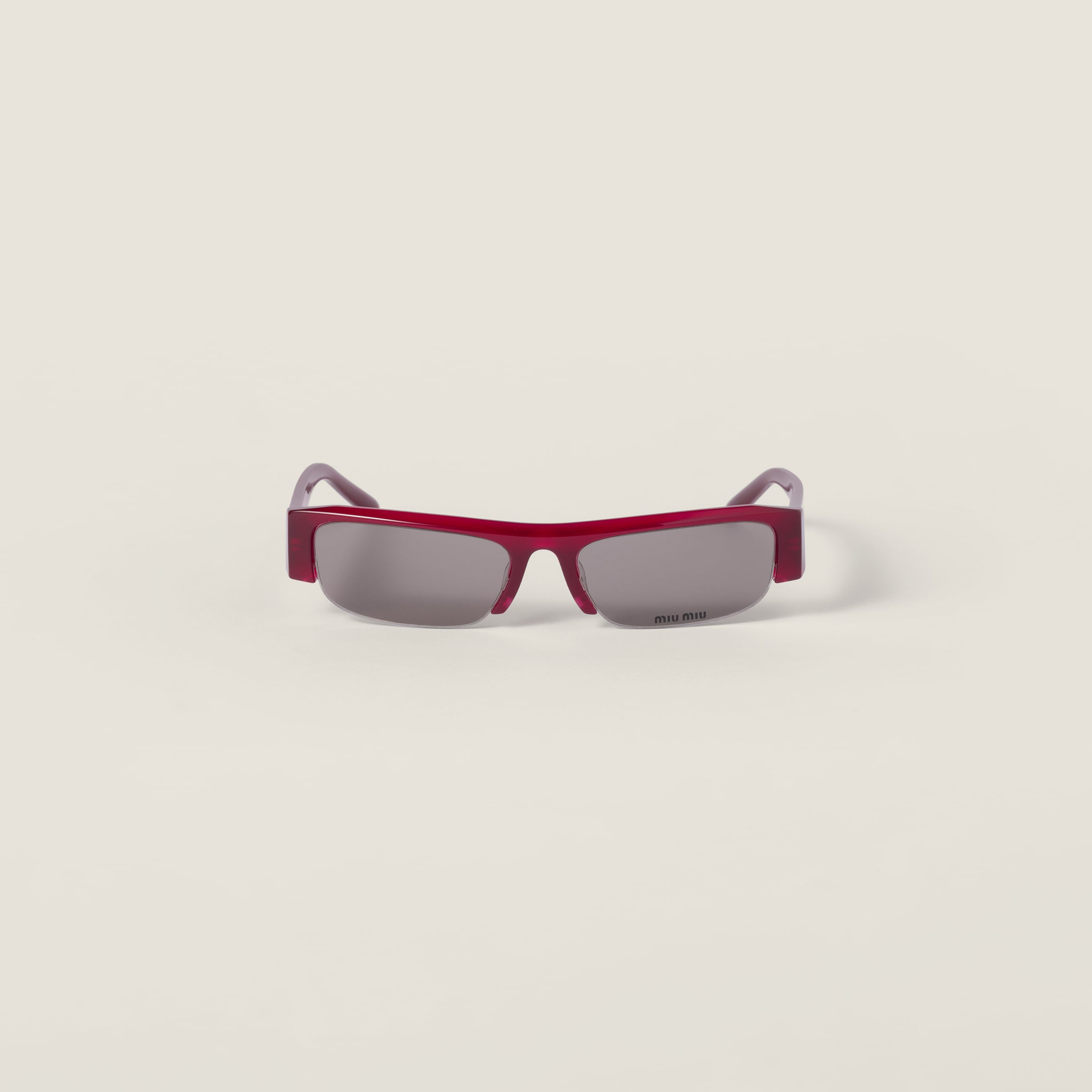 The eyewear from the FW25 Fashion Show, inspired by the early 2000s, combines the design of the narrow, rectangular frame with chunky temples. The lenses are decorated with the Miu Miu logo, a bold and glamorous touch that recalls the instinct to wear them immediately. - Product code: SMUB07_E21I_FE80Q_C_051 - Acetate frame front - Color: Opaline Burgundy - Frame compatible with graduated lenses - 100% UVA / UVB protection - Standard fit - Lens-nose-temple measurements: 51-17-140 mm - Article comes with dedicated packaging - Imported Materials Main material: Acetate