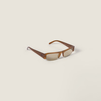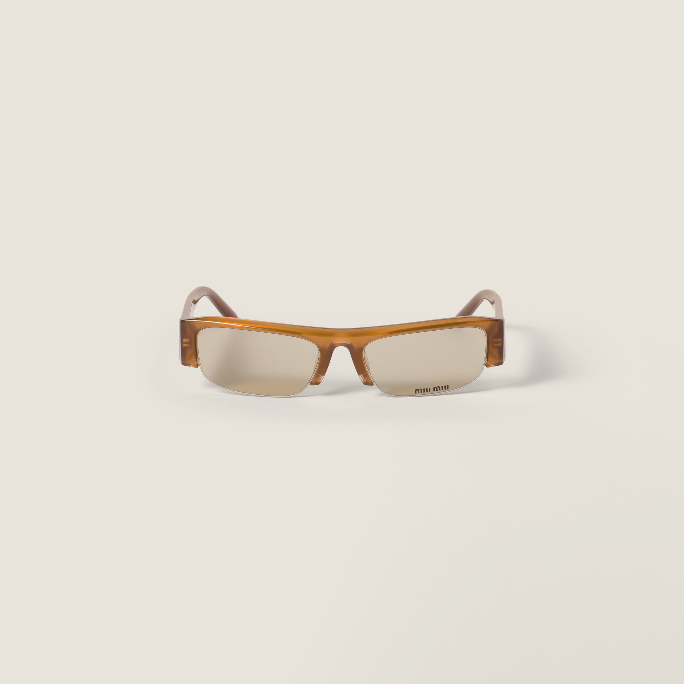 The eyewear from the FW25 Fashion Show, inspired by the early 2000s, combines the design of the narrow, rectangular frame with chunky temples. The lenses are decorated with the Miu Miu logo, a bold and glamorous touch that recalls the instinct to wear them immediately. - Product code: SMUB07_E22I_FE10R_C_051 - Acetate frame front - Opaline Amber - Frame compatible with graduated lenses - 100% UVA / UVB protection - Standard fit - Lens-nose-temple measurements: 51-17-140 mm - Article comes with dedicated packaging - Imported Materials Main material: Acetate