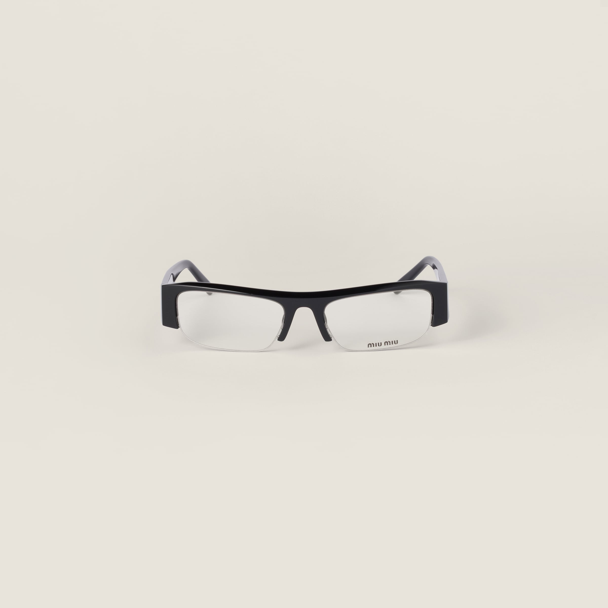 The eyewear from the FW25 Fashion Show, inspired by the early 2000s, combines the design of the narrow, rectangular frame with chunky temples. The lenses are decorated with the Miu Miu logo, a bold and glamorous touch that immediately makes you want to wear them. - Product code: SMUB07_S16K_FE08N_C_051 - Recycled bio-acetate frame front - Color: Black - Frame compatible with graduated lenses - 100% UVA / UVB protection - Blue Light lenses without prescription have a special filter to reduce exposure to the blue light of digital devices and sunlight - Standard fit - Lens-nose-temple measurement: 51-17-140 mm - Article comes with dedicated packaging - Imported Materials Main material: Acetate