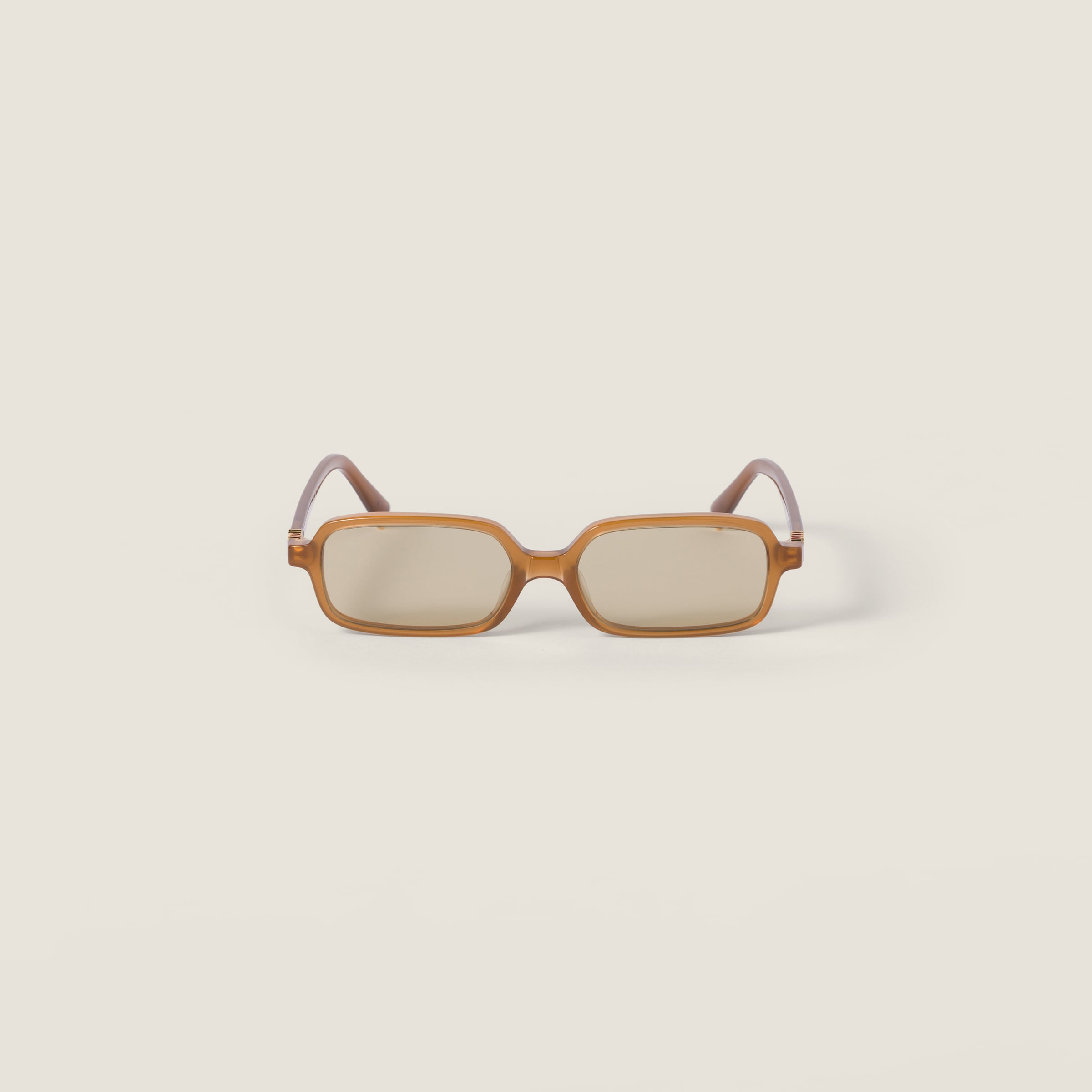 Acetate sunglasses with a sophisticated rectangular shape. The frame features thin rims and ultra-flat lenses that emphasize extreme lightness. The vertical Miu Miu logo decorates the temples, adding a refined touch. - Product code: SMU11Z_E22I_FE10R_C_051 - Acetate frame front - Color: Opaline Amber - Frame not compatible with graduated lenses - 100% UVA / UVB protection - Standard fit - Lens-nose-temple measurements: 51-16-140 mm - Article comes with dedicated packaging - Imported Materials Main material: Acetate