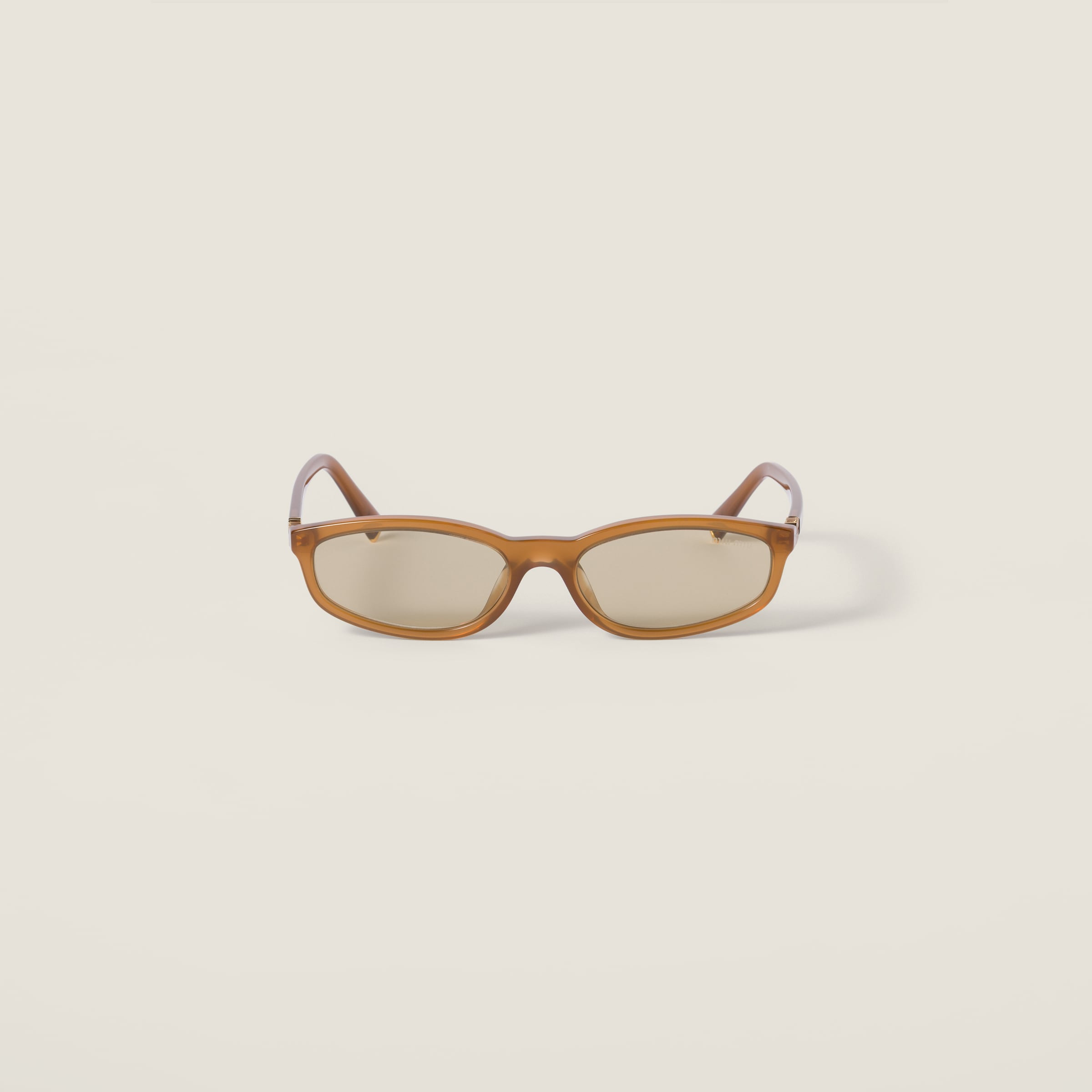 Miu Regard sunglasses are reinterpreted in a new sophisticated, classic version. The frame has narrow rectangular lenses and slim rims that enhance its extreme lightness. The temples are embellished with the refined touch of the vertical Miu Miu logo. - Product code: SMUA06_E22I_FE10R_C_054 - Acetate frame front - Opaline Amber - Frame compatible with graduated lenses - 100% UVA / UVB protection - Standard fit - Lens-nose-temple measurements: 54-17-140 mm - Article comes with dedicated packaging - Imported Materials Main material: Acetate