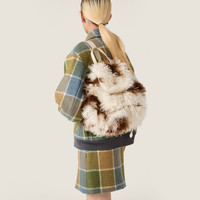 The soft mohair yarn of this backpack creates a fur-like effect and pays homage to the animal print theme through chromatic contrasts that enhance the lines and experimental spirit of this Miu Miu icon. - Product code: 5BZ042_2IE4_F0C64_V_OOO - Leather handle - Front zipper pocket - Side flap pockets - Gold-tone hardware - Flap closure with buckle - Fabric interior with zipper pocket - Leather lettering logo on the flap - Imported Height 29.5cm Width 25cm Length 12.5cm Materials Fabric