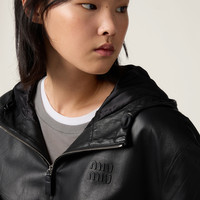 The casual lines of this hooded jacket are paired with nappa leather, an iconic Miu Miu material, made soft and light through a special pressing process. - Product code: MPV933_13UB_F0002_S_OOO - Regular fit - Lined garment - Center zipper closure - Stand-up collar and hood - Straight sleeves and elasticized cuffs - Welt pockets - Elasticized drawstring hem - Pressed finished garment - Embossed lettering logo - Imported - The model is 176 cm tall and wears a size 38 Materials Main material: Lambskin