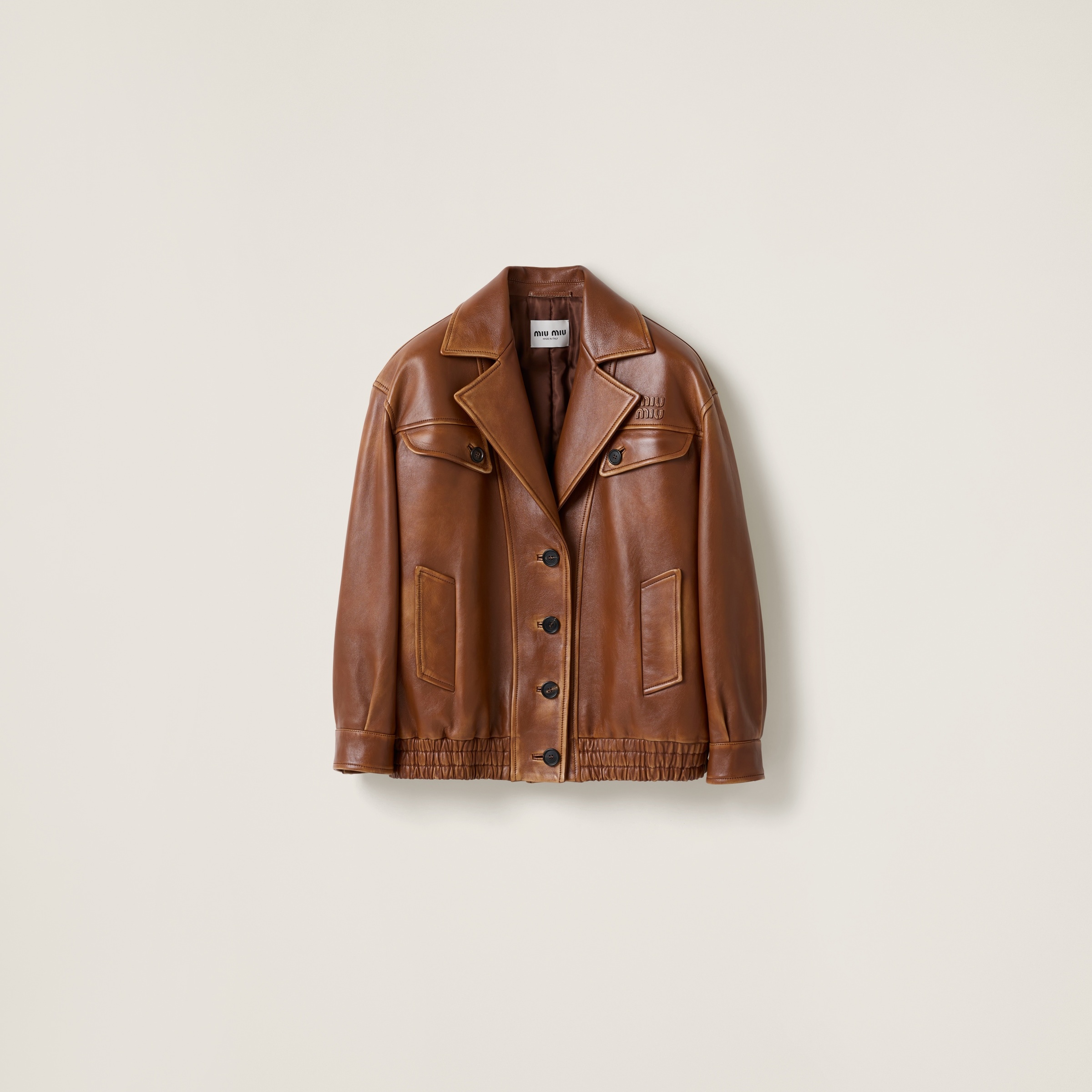Miu Miu's experimentation with vintage is expressed in the lines of this jacket, in which the aged treatment of nappa leather enhances its iconic essence and style. - Product code: MPV921_1134_F04DR_S_OOO - Regular fit - Vintage treatment - Lined garment - Padded with wadding - Notch lapels - Front button closure - Straight sleeves with shirt-style cuffs - Wide-welt pockets - Elasticized hem - Embossed lettering logo - Imported - The model is 178 cm tall and wears a size 38 Height 68cm Materials Main material: Lambskin