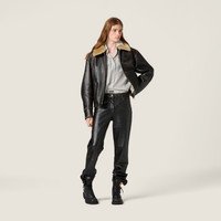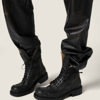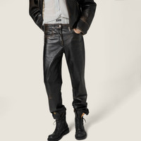 These menswear-inspired pants are made of soft nappa leather that has undergone a special aged treatment that gives the garment vintage allure, enhancing the color and relaxed fit. - Product code: MPP403_1134_F0002_S_OOO - Regular fit - Vintage treatment - Five pockets - Lined garment - Zipper fly with tack button - Waistband with belt loops - Embossed lettering logo - Imported - The model is 180 cm tall and wears a size 38 Height 40cm Materials Main material: Lambskin