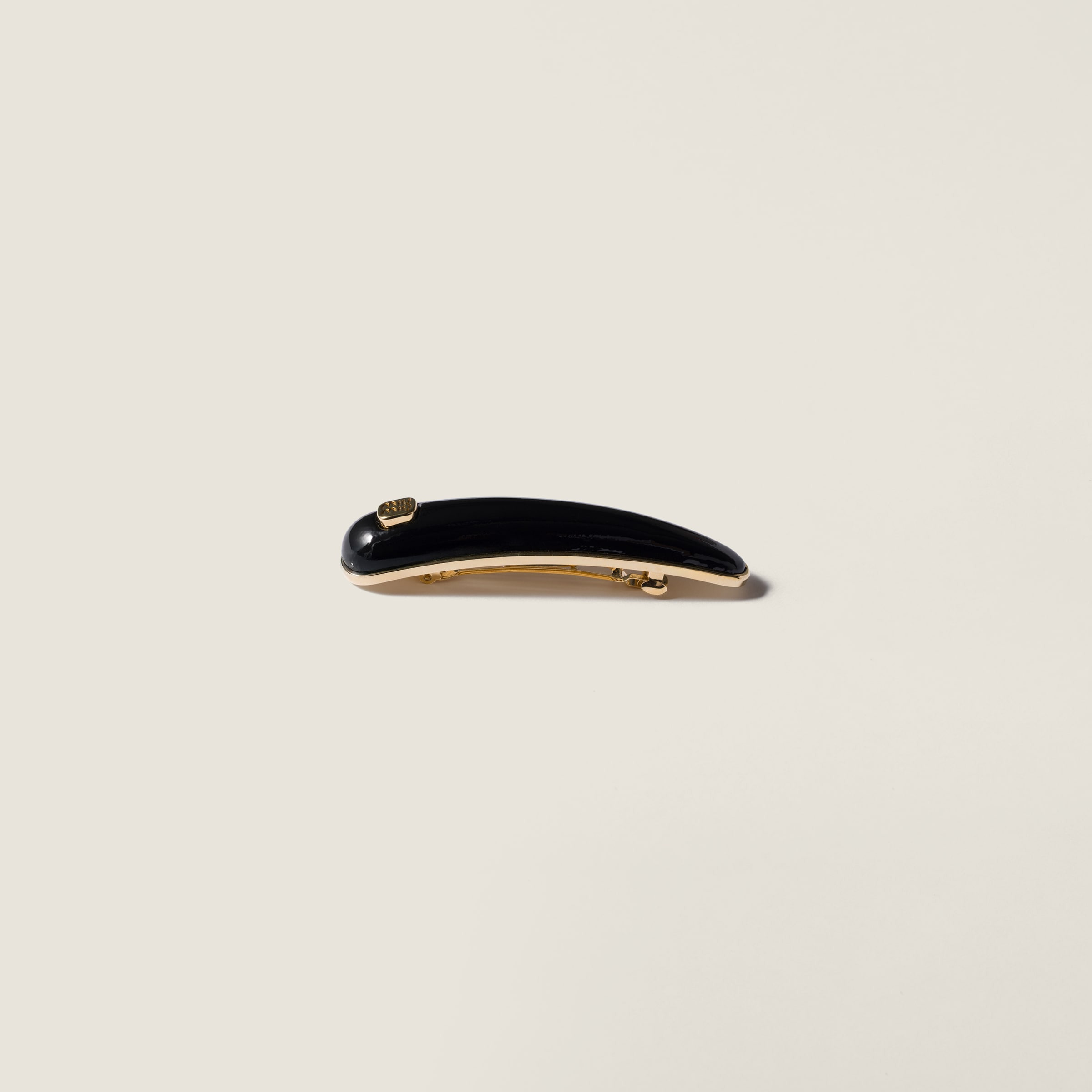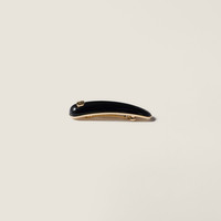 The iconic Miu Miu metal logo adds a contemporary accent to this patent leather hair clip, completing each look with a touch of strong and sophisticated femininity. - Product code: 5IF240_069_F0002 - Metal clip on the back - Visible metal logo - Imported Height 1.5cm Width 8cm Materials Main material: Lambskin