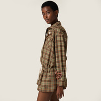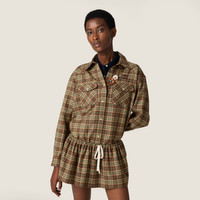 The sporty essence of the Miu Miu wardrobe is reinterpreted through classic fabrics. This plaid skirt stands out for its mini silhouette and soft line defined by the drawstring waist, an element of experimentation and contemporary versatility. - Product code: MG2523_174R_F0C59_S_OOO - Mini silhouette - Front drawstring closure - Lettering logo - Imported - The model is 180 cm tall and wears a size 38 Height 27cm Materials Main material: 100% Virgin Wool