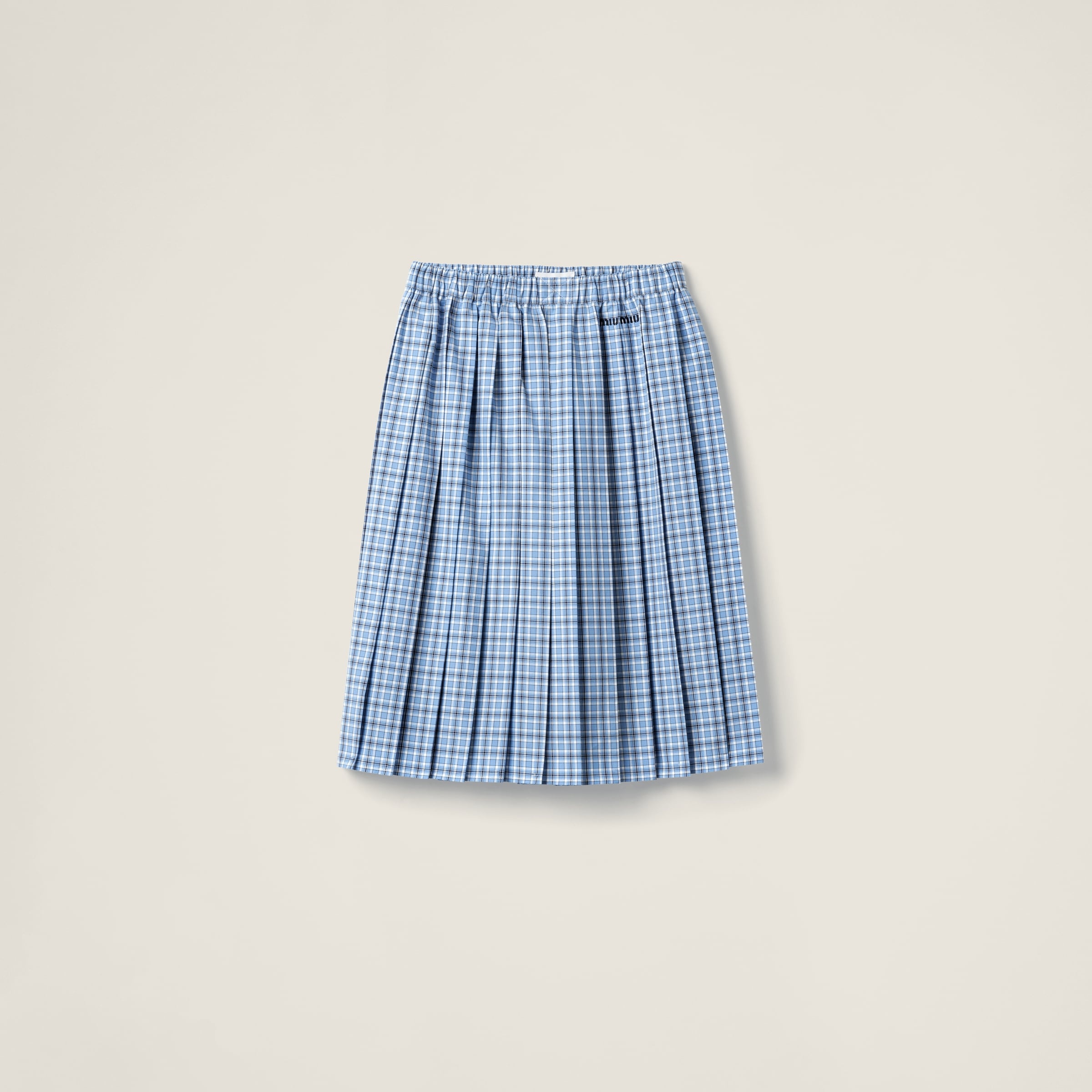 The check motif of this skirt reflects Miu Miu's bold, vintage spirit. The pleated silhouette is combined with iconic poplin, revealing an experimental contrast between menswear and womenswear elements. - Product code: MG2228_16MK_F0QY6_S_UMO - Unlined garment - Embroidered logo - Imported - The model is 177 cm tall and wears a size 38 Height 61cm Materials Main material: 100% Cotton