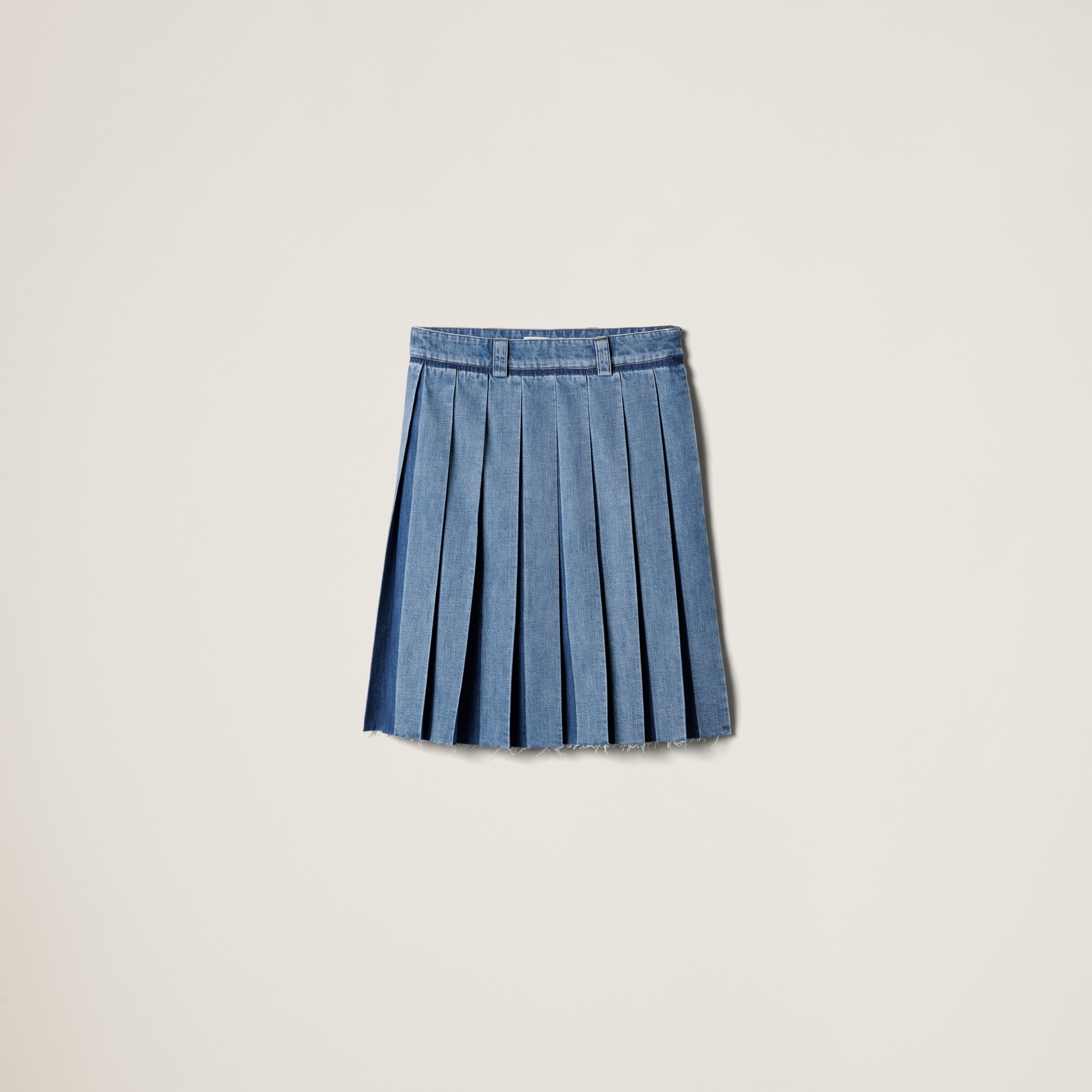 The washed treatment that characterizes the texture of the denim enhances the pleated silhouette of this skirt, interpreting elegant experimentation and relaxed, vintage charm. - Product code: GWD279_17GG_F0076_S_231 - Washed denim treatment - Classic fit - Unlined garment - Low-rise waist - Side zipper closure with hook - Contrasting top-stitching - Center-back length: 61.5 cm, Size: 38 - Embroidered logo - Imported - The model is 178 cm tall and wears a size 38 Height 61cm Materials Main material: 100% Cotton