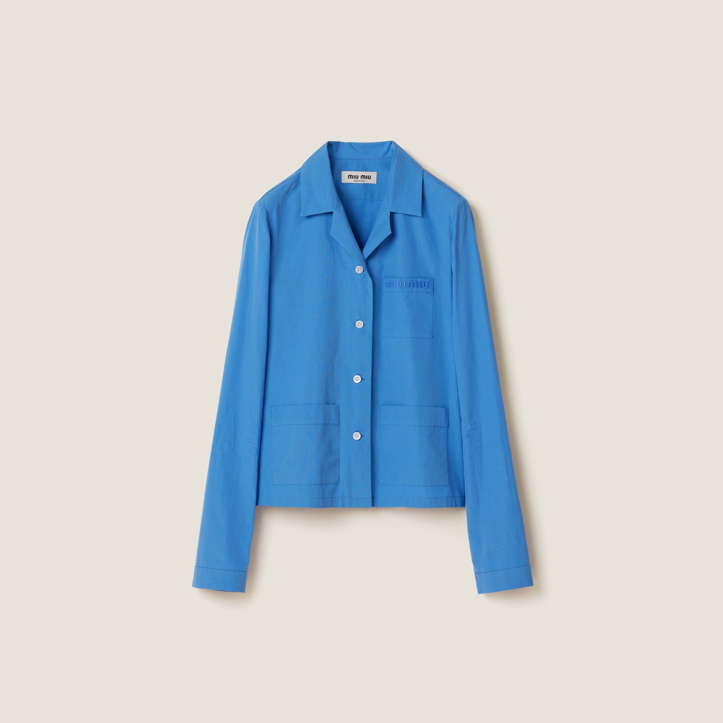The detail of large pockets stand out against the crisp poplin fabric, while the tonal Miu Miu logo completes the design with an iconic note. - Product code: MK1884_15UL_F0013_S_OOO - Straight fit - Bowling collar - Front button closure - Long sleeves - Patch pocket on the front - Embroidered logo - Imported - The model is 180 cm tall and wears a size 38 Materials Main material: 100% Cotton