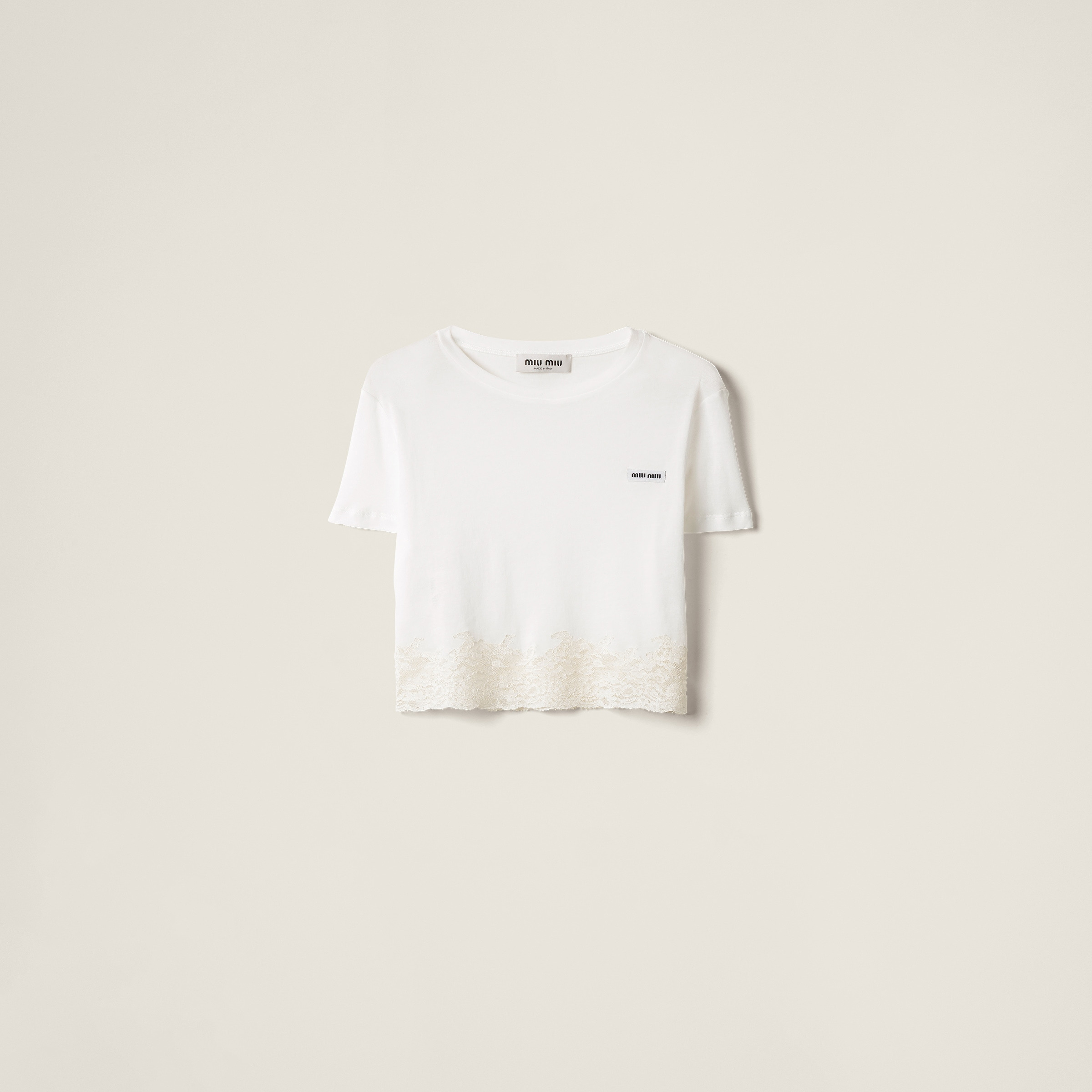 Fascinating references to lingerie accentuates the lines of this ribbed jersey tee embellished with sophisticated lace details that highlight its elegance and uniqueness. - Product code: MT2155_16J0_F0009_S_OOO - Unlined garment - Crew-neck - Short sleeves - Lace-trimmed hem - Logo patch - Imported Materials Main material: 100% Cotton