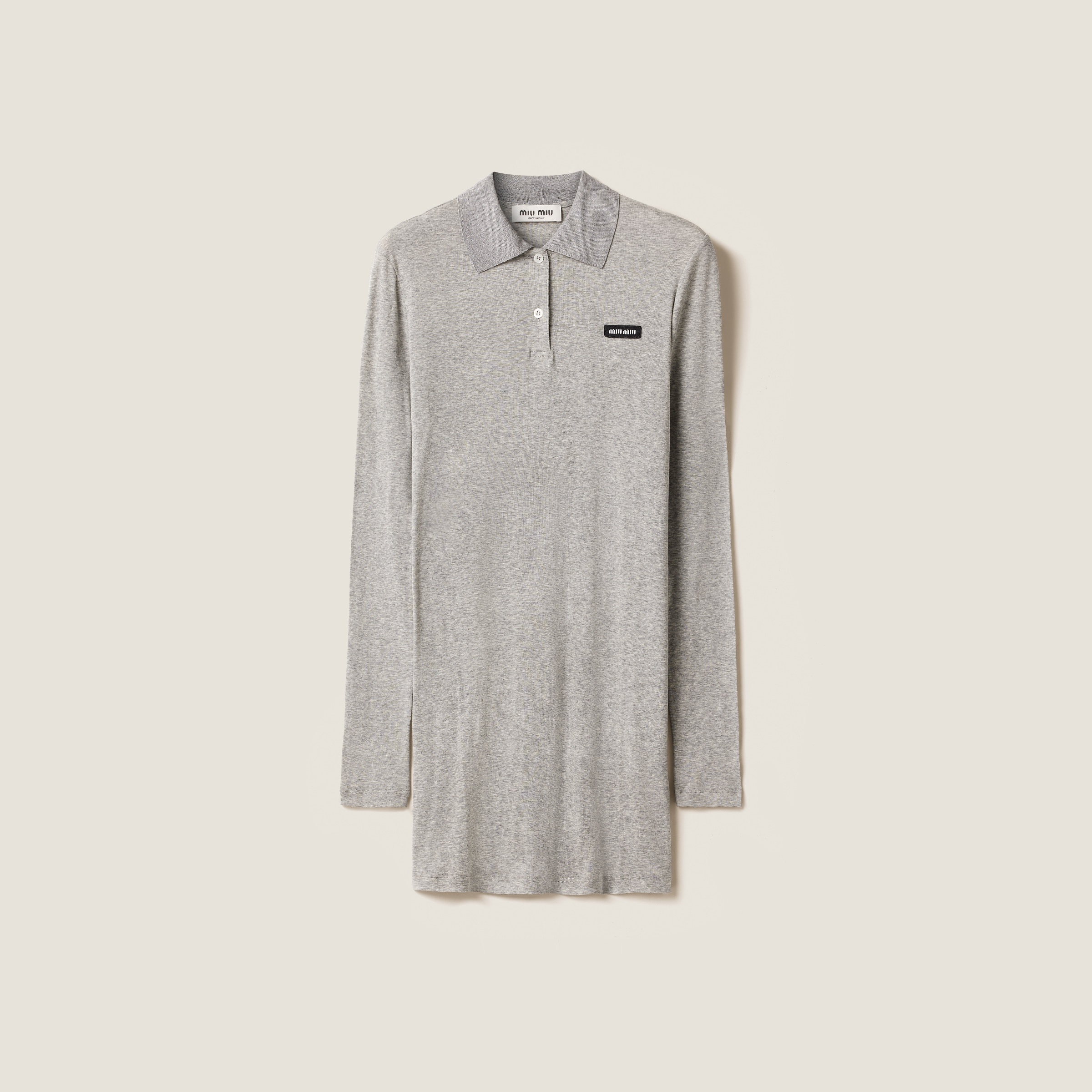 Understated lines and subtle transparencies redefine this ribbed knit dress, creating a play of lightness and bold versatility. - Product code: MJA891_133O_F0031_S_OOO - Straight fit - Long sleeves - Polo collar - Twin-needle hem - Logo patch - Imported - The model is 179 cm tall and wears a size 39 Height 75cm Materials Main material: 100% Cotton