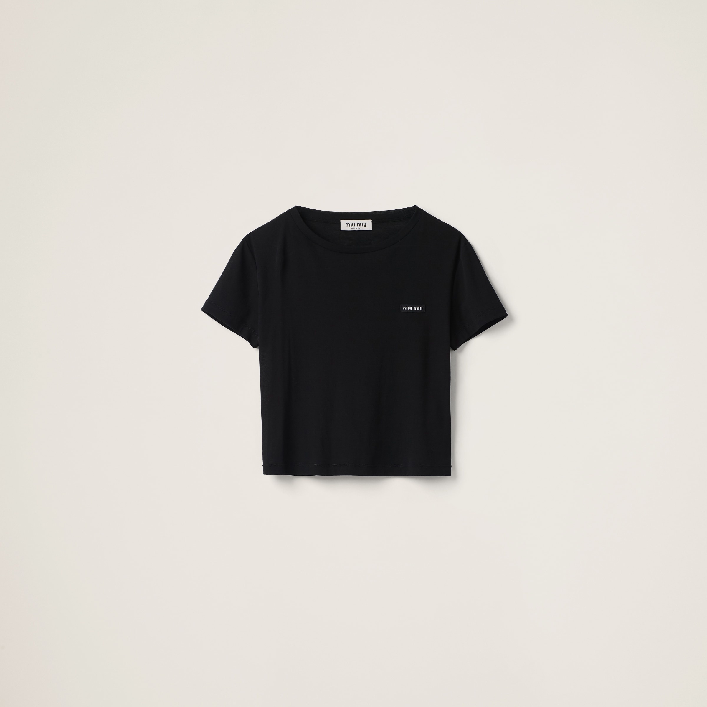 Miu Miu's logo patch enriches the simple lines of this tee, adding an iconic and distinctive character to the garment. - Product code: MJN466_133O_F0002_S_231 - Slim fit - Crew-neck - Short sleeves - Logo patch - Twin-needle hem - Imported Height 50cm Materials Main material: 100% Cotton