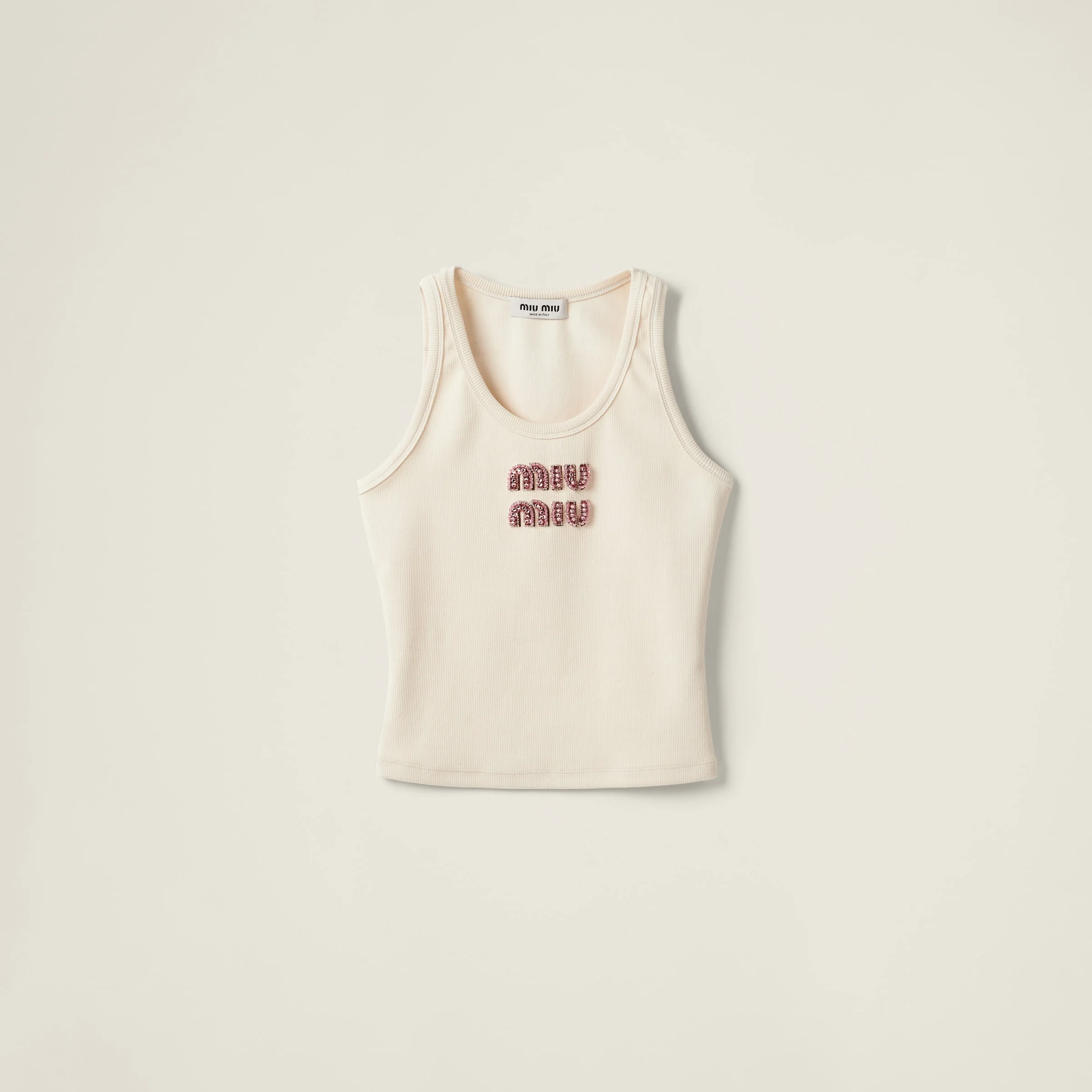 Miu Miu's embroidered logo enhances this ribbed jersey top, adding a chromatic contrast and iconic note to the garment. The slim fit is accentuated by the ribbing. - Product code: MJT682_14AS_F0HAT_S_OOO - Slim fit - Sleeveless - Embroidered logo - Twin-needle hem - Height: 50cm - Imported
