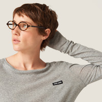 The Miu Miu logo patch gives an iconic and distinctive character to the sleek lines of this ribbed jersey dress that, thanks to its versatility, is perfect for creating different looks. - Product code: MJA842_133O_F0031_S_231 - Straight fit - Round neck - Long sleeve - Logo patch - Twin-needle hem - Imported - The model is 179 cm tall and wears a size 38 Height 75cm Materials Main material: 100% Cotton