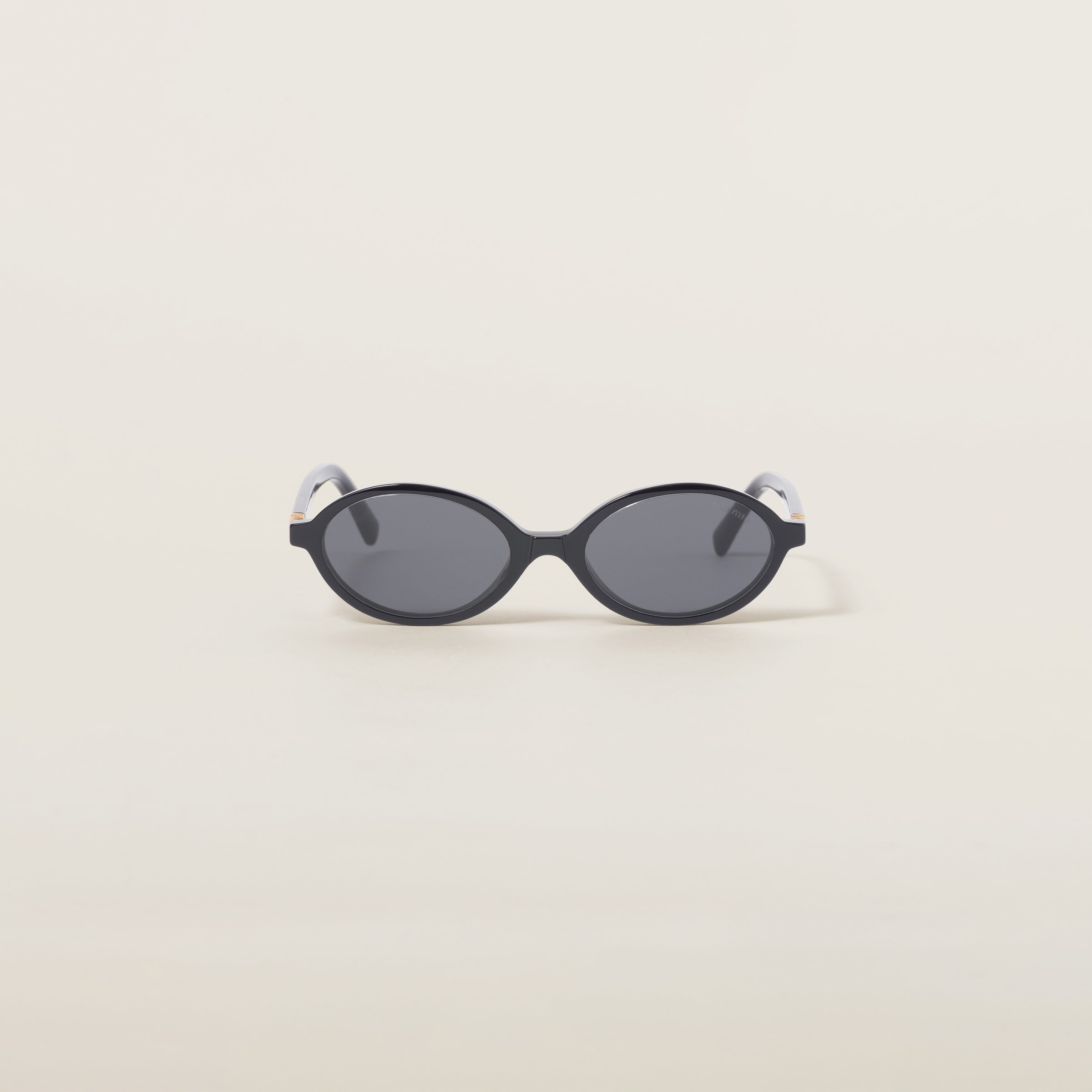Acetate sunglasses with a sophisticated oval shape. The acetate frame has thin rims and ultra-flat lenses that highlight the extreme lightness. The vertical Miu Miu logo embellishes the temples with a refined touch. - Product code: SMU04Z_E1AB_F05S0_C_050 - Acetate frame front - Color: Black - Frame not compatible with graduated lenses - 100% UVA / UVB protection - Standard fit - Lens-nose-temple measurements: 50-18-140 mm - Article comes with dedicated packaging - Imported Materials Main material: Acetate