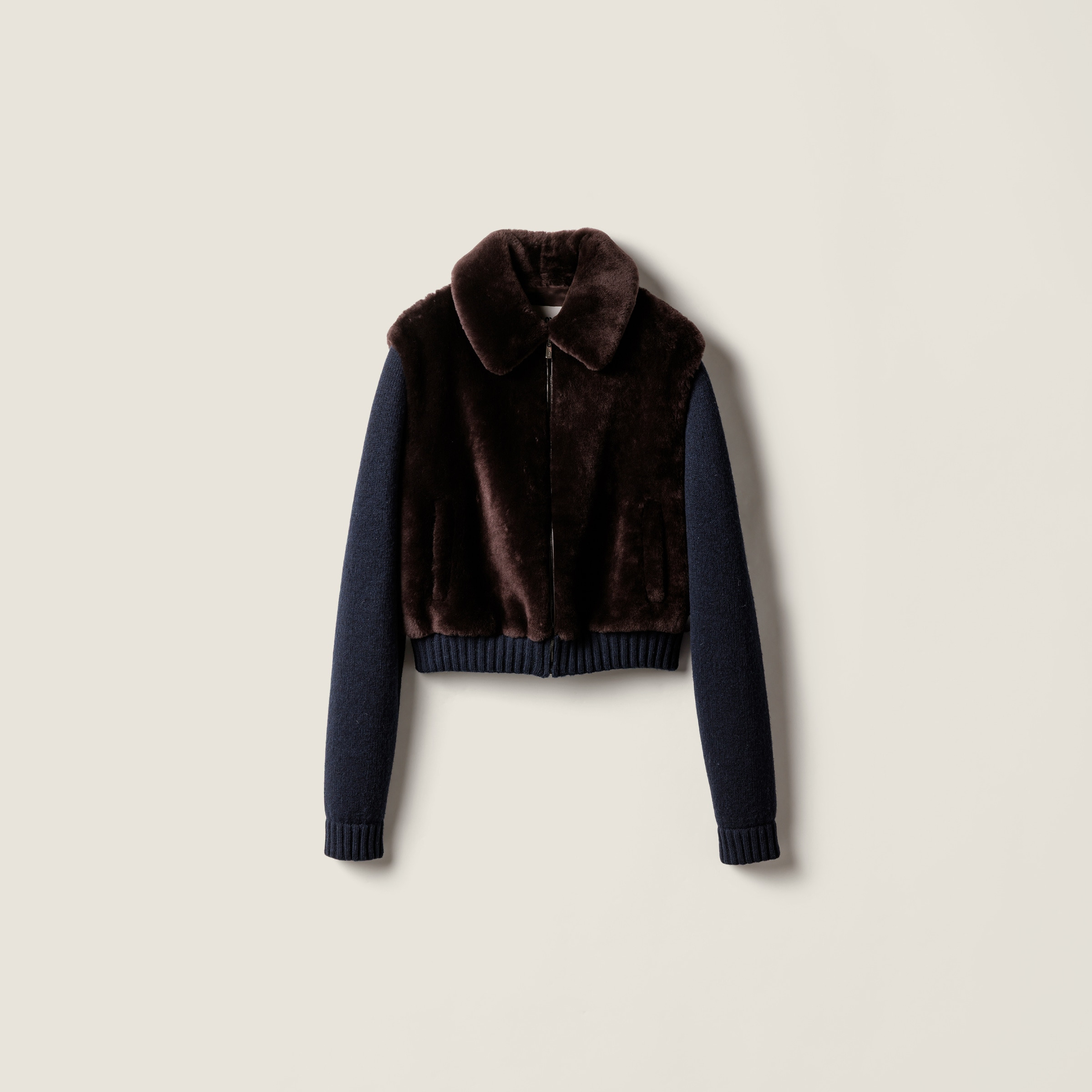 The soft elegance of the shearling paired with Shetland wool and cashmere knitwear reflects the craftsmanship of the Miu Miu wardrobe. Harmonious volumes come together with contemporary details interpreting the essence of an elegant, cozy garment. - Product code: MPV963_177S_F0201_S_OOO - Regular fit - Lined garment - Shirt-style collar - Front zipper closure - Knit sleeves with ribbed knit cuffs - Wide welt pockets - Ribbed knit hem - Hot-stamped logo - Imported - The model is 178 cm tall and wears a size 38 Materials Main material: Lambskin