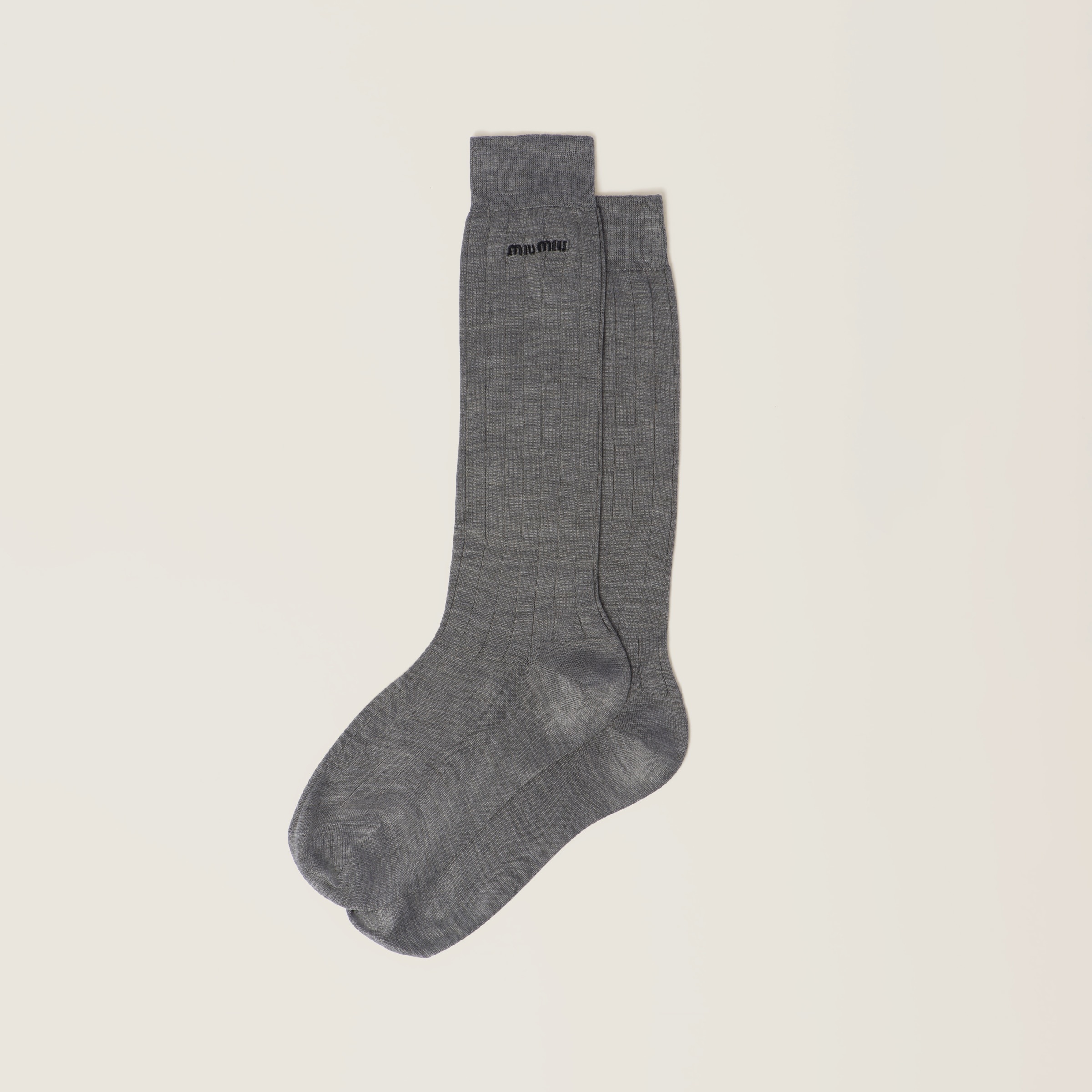 The embroidered Miu Miu logo adds an iconic touch to these silk socks with a smooth, compact feel. - Product code: MCZ475_14A0_F0480_S_OOO - Ribbed knit - Embroidered logo - Imported - The model is 178 cm tall and wears a size 38 Materials Main material: 100% Silk