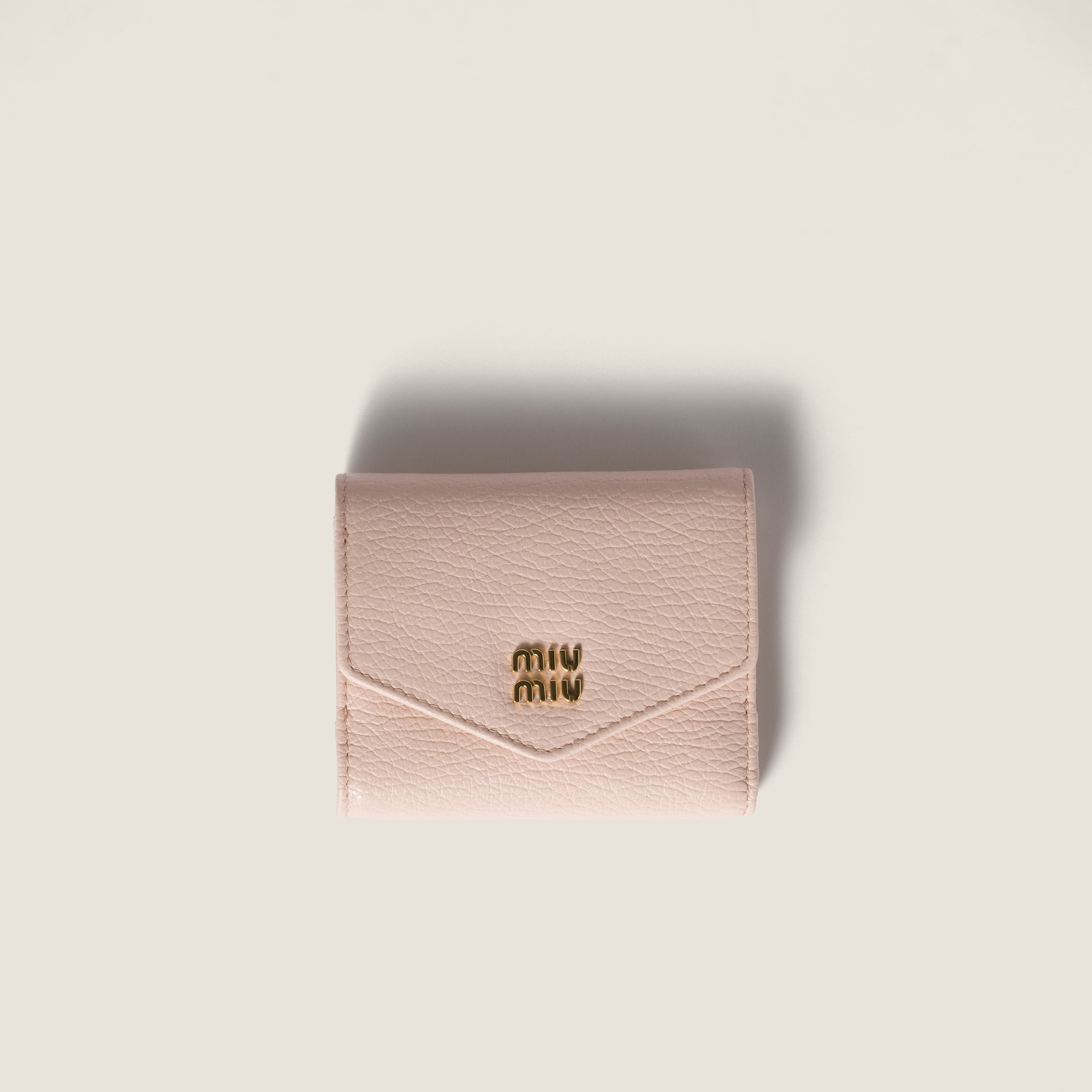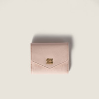 The quality of the leather and the iconic touch of the Miu Miu logo enhance the sleek lines of this new small leather wallet. Several internal compartments, card slots, and compact lines complete the design with functional details. - Product code: 5MH043_ADT7_F0LOZ - Metal lettering logo - One bill compartment - Four card slots - Two internal pockets - Internal coin pocket with flap - One external pocket -- Moire lining - Imported Height 8.5cm Width 10cm Materials Main material: Calfskin