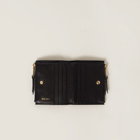 The quality of leather and the iconic touch of Miu Miu logo enrich the sleek lines of this new small leather wallet. Several internal compartments complete the design with functional details. - Product code: 5ML024_AEFX_F0002 - Snap closure - Embossed lettering logo - One bill compartment - Eight card slots - Two external zipper pockets - Moire lining - Imported Height 8.5cm Width 11.5cm Materials Main material: Lambskin