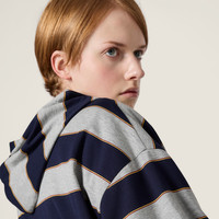 Miu Miu's iconic stripes are reinvented in color contrasts with classic gray melange, enhancing the relaxed character of jersey and the silhouette of this hoodie, ideal for layered looks. - Product code: MJLA38_19DD_F005R_S_OOO - Oversized fit - Lined garment - With hood - Front zipper closure - Long sleeves with ribbed knit cuffs - Pouch pockets - Straight hem with ribbed knit band - Logo patch - Imported - The model is 177 cm tall and wears a size 38 Height 70cm Materials Main material: 100% Cotton