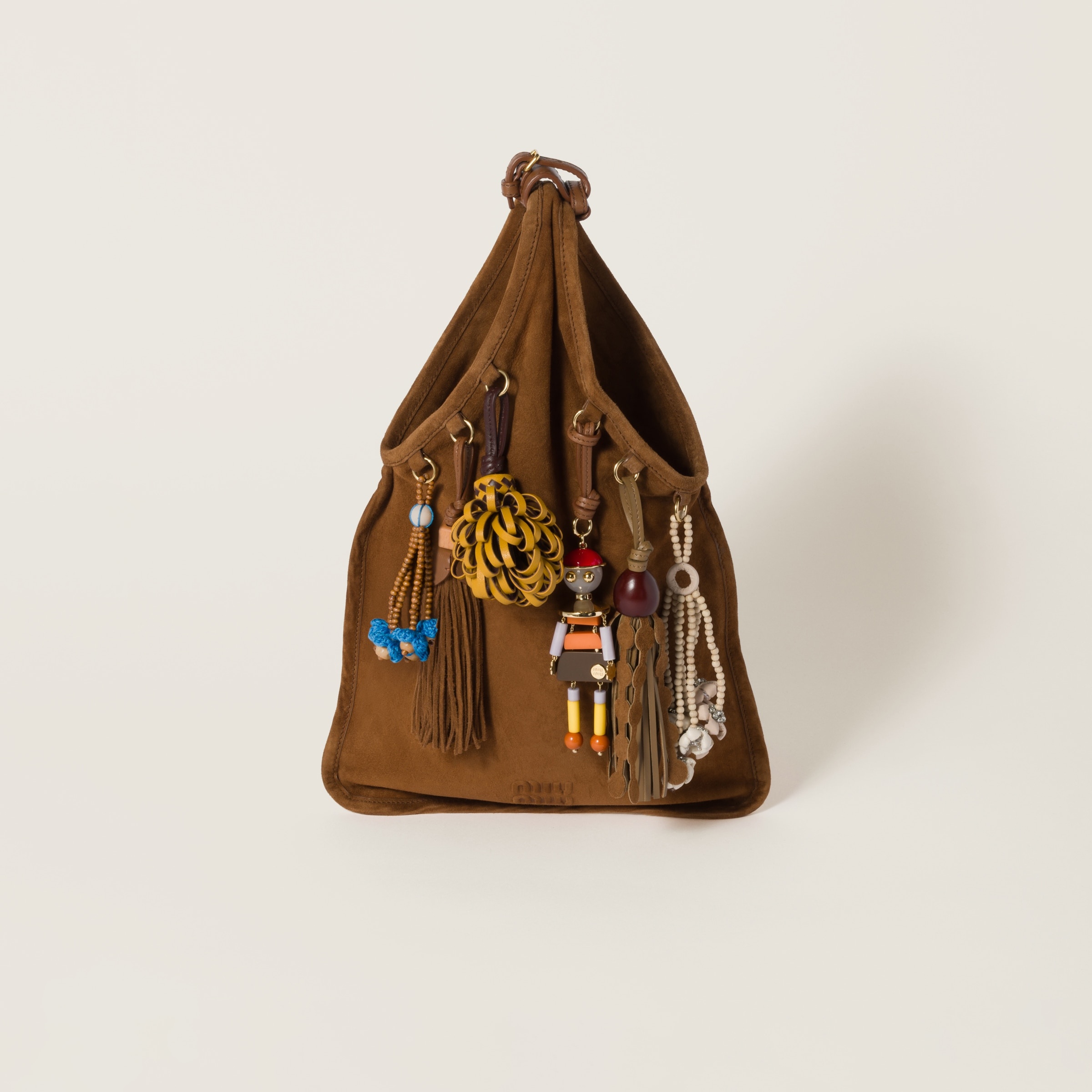Elegant, soft suede is combined with the playful character of small removable tricks that embellish this hobo bag, a perfect interpretation of runway inspirations and Miu Miu's Messy-Chic character. - Product code: 5BA295_2IBU_F0316_V_OT5 - Leather handle - Trick appliques - Gold-tone hardware - Leather lining with patch pocket - Embossed lettering logo - Imported Height 37cm Width 24cm
