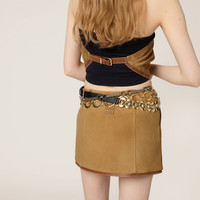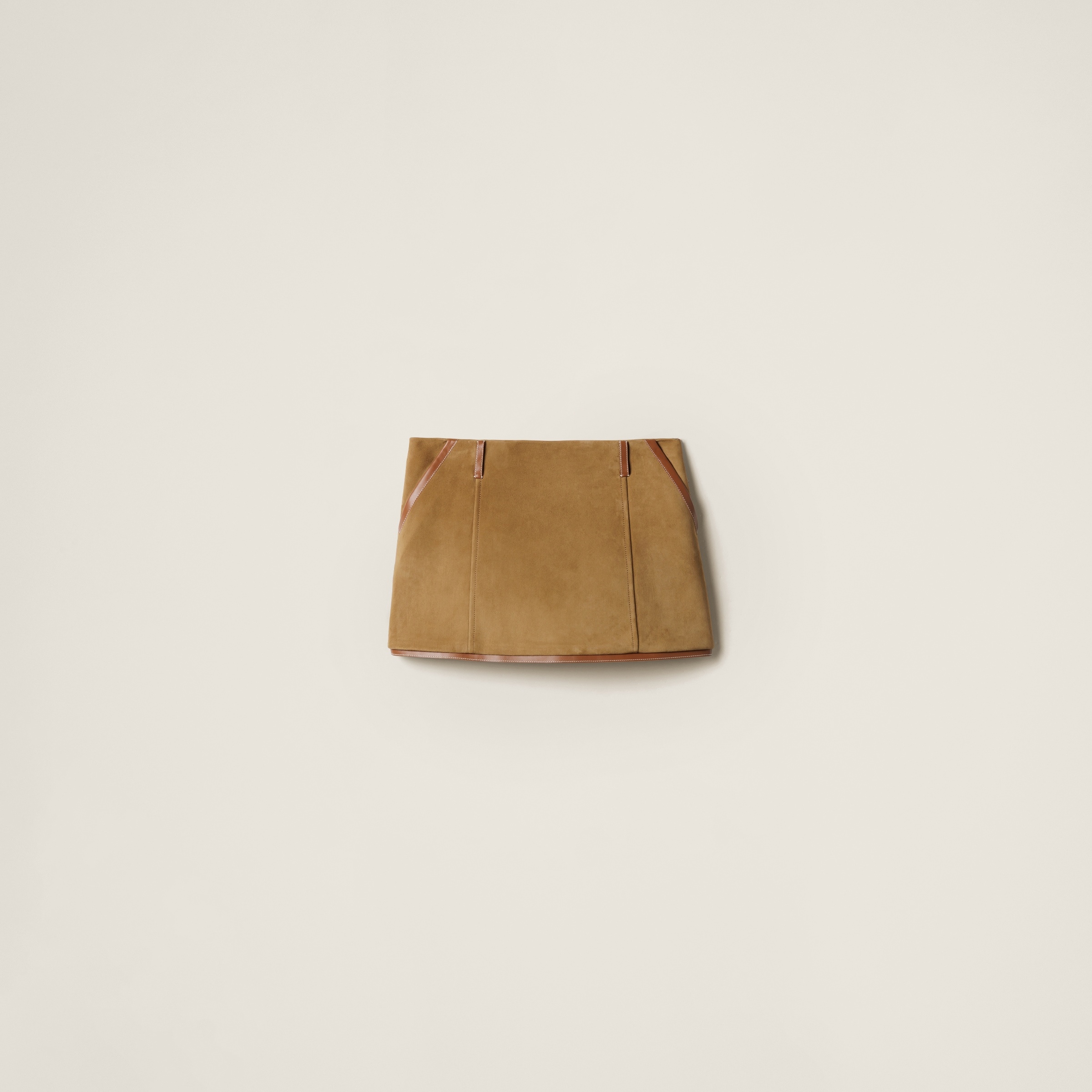 The soft texture of this suede skirt is enriched with refined tonal leather trim that enhances the bold, feminine design, revealing a sophisticated balance of the summer season. - Product code: MPD811_17QK_F0JRS_S_OOO - Regular fit - Lined garment - Side zipper closure - Wide welt pockets - Calf leather trim - Embossed logo - Imported - The model is 180 cm tall and wears a size 38 Height 28cm Materials Main material: Lambskin