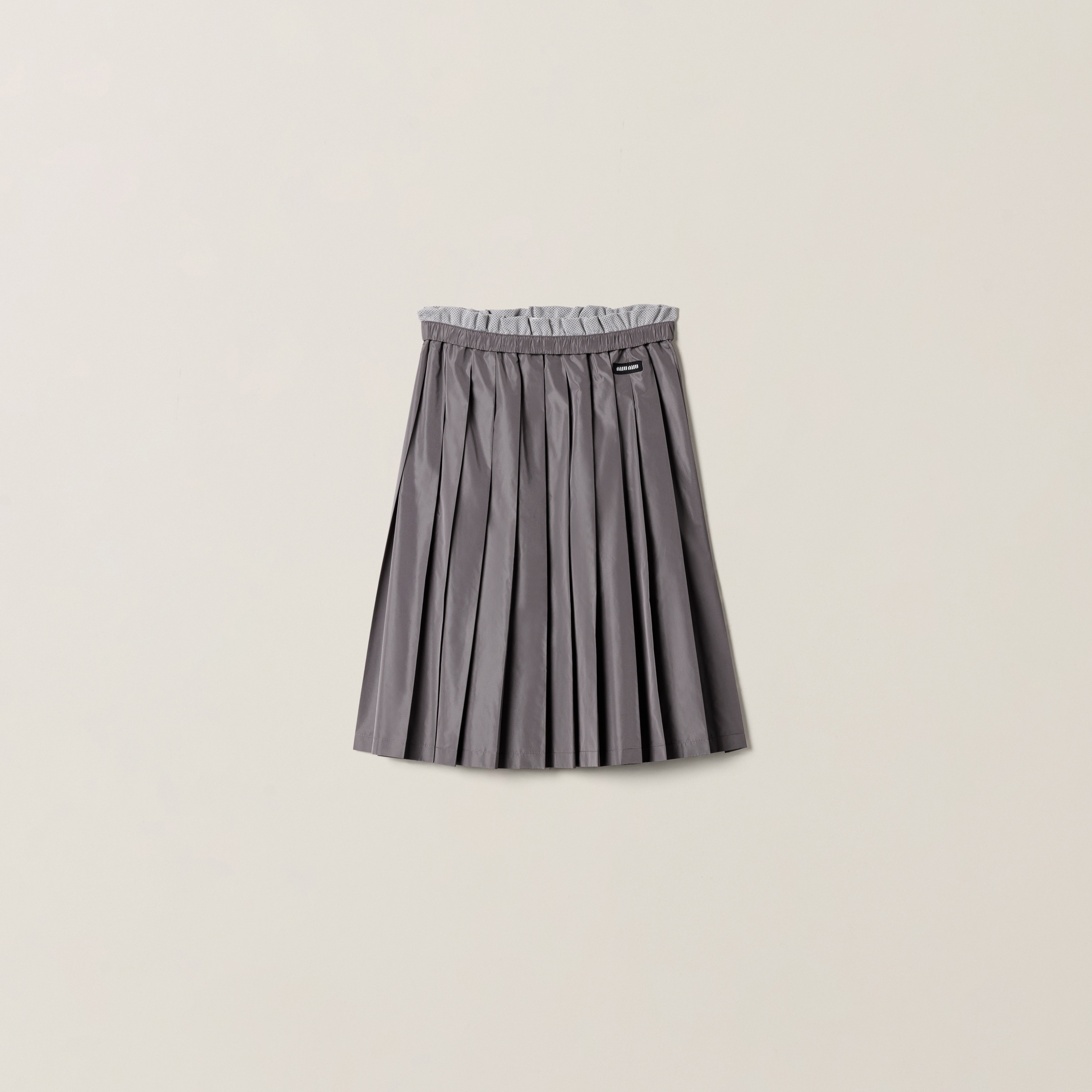 The sporty effect of technical silk enhances the bold character of this skirt with distinctive pleating and turn-down edge on the waistband revealing the mesh lining. - Product code: MG2467_121G_F0024_S_OOO - Pleated silhouette - Elasticized waistband - Knit logo patch - Imported - The model is 180 cm tall and wears a size 38 Height 61cm Materials Main material: 24% Silk 76% Recycled Polyester