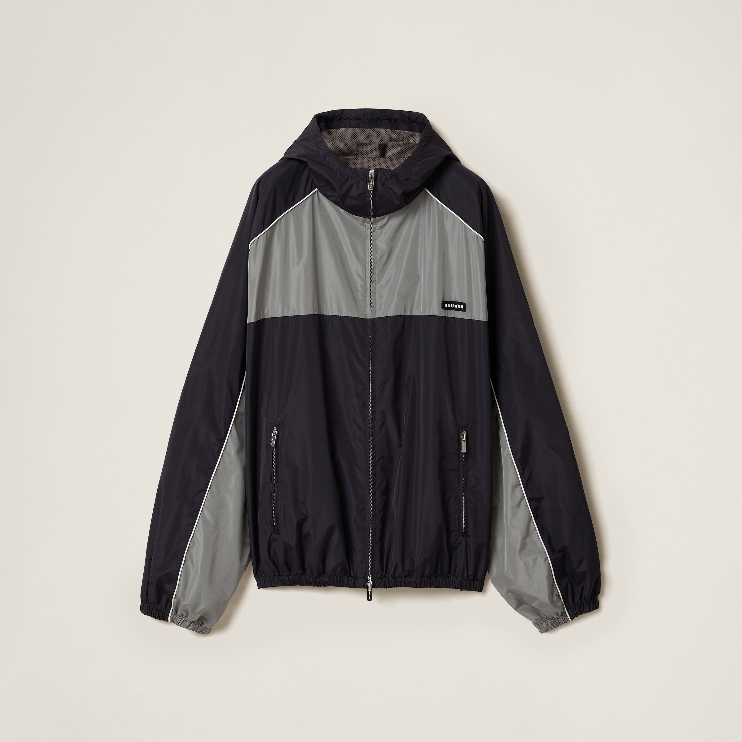 Technical silk fabric with a sporty, casual attitude enhances the lines of this zipper blouson jacket with an oversized fit to wear with classic garments, defining the iconic essence of the Miu Miu uniform. - Product code: ML1220_163P_F097B_S_OOO - Lined garment - Long sleeves - Lined drawstring hood - Elasticized cuffs - Zipper closure - Zipper pockets - Visible logo patch - The product fits up to two sizes larger - Imported Height 80cm Materials Main material: 24% Silk 76% Recycled Polyester