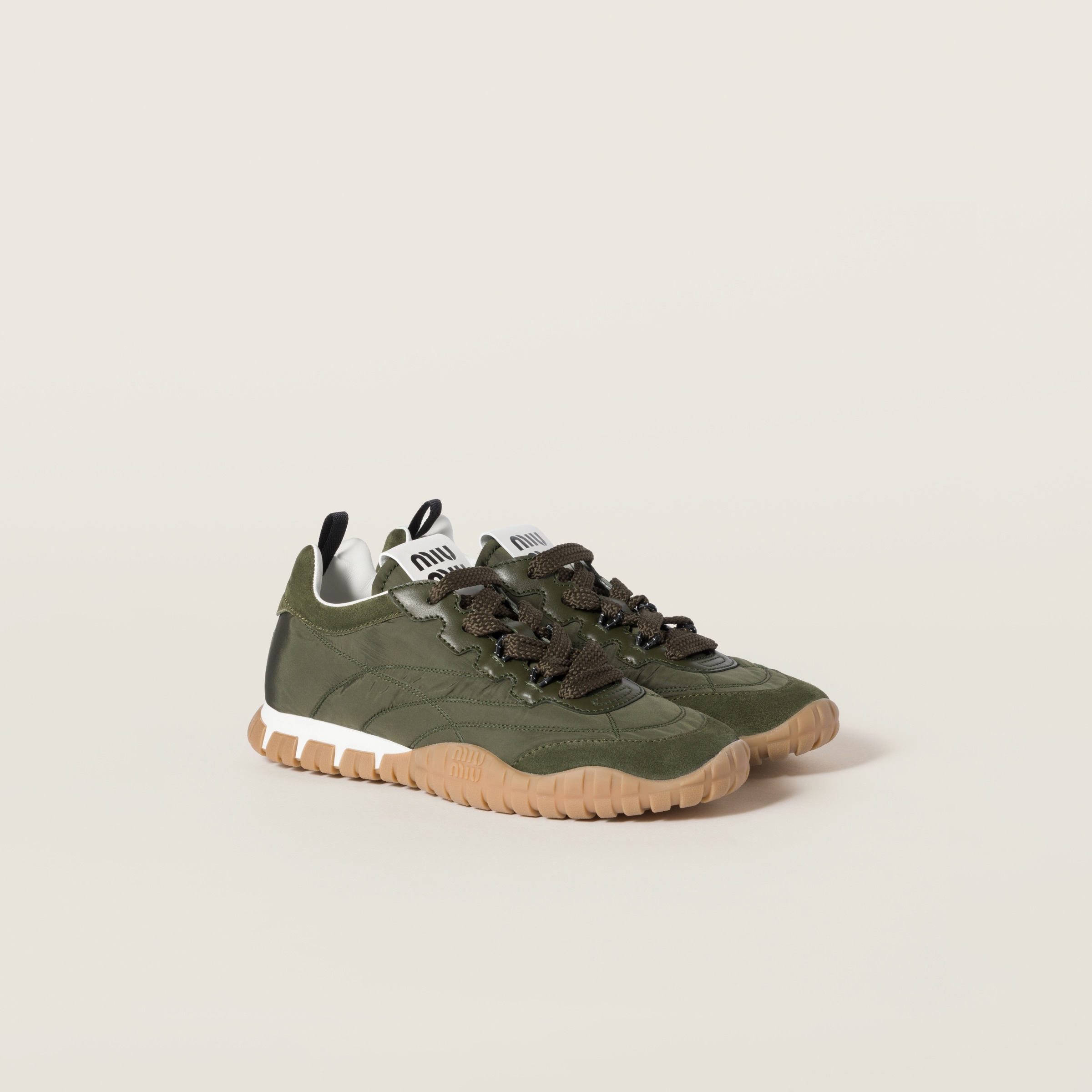 Tyre combines elegance and sporty functionality. The dynamic rubber sole, which is flexible and scuff-proof, recalls the pattern on tires. Made of technical fabric and suede, these sneakers express Miu Miu's bold identity. - Product code: 5E417E_ZJM_F0466_F_005 - Laces closure - Fabric and leather lining - Screen-printed logo on the tongue, heel collar, and insole - EVA and rubber sole with logo - Star-patterned tread - Removable leather-covered insole - Imported Materials Main material: Recycled Polyamide