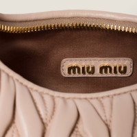 The Wander bag is reinterpreted season after season, becoming an iconic accessory of Miu Miu collections. Made of matelasse nappa leather, the bag is characterized by the sophisticated, three-dimensional effect created by the refined workmanship. The hobo shape, blending retro inspirations and contemporary elegance, becomes a new synonym of modern femininity. - Product code: 5BC125_AN88_F0236_V_OOY - Matelasse motif - Leather shoulder strap, length 110 cm - Gold-tone hardware - Metal lettering logo on the front - Zipper closure - Cotton satin lining - This bag can hold a phone 16 cm x 7.8 cm x 0.76 cm in size - The small Miu Miu wallet can be conveniently placed in this bag - Imported Height 17cm Width 20cm Length 6cm Materials Main material: Lambskin