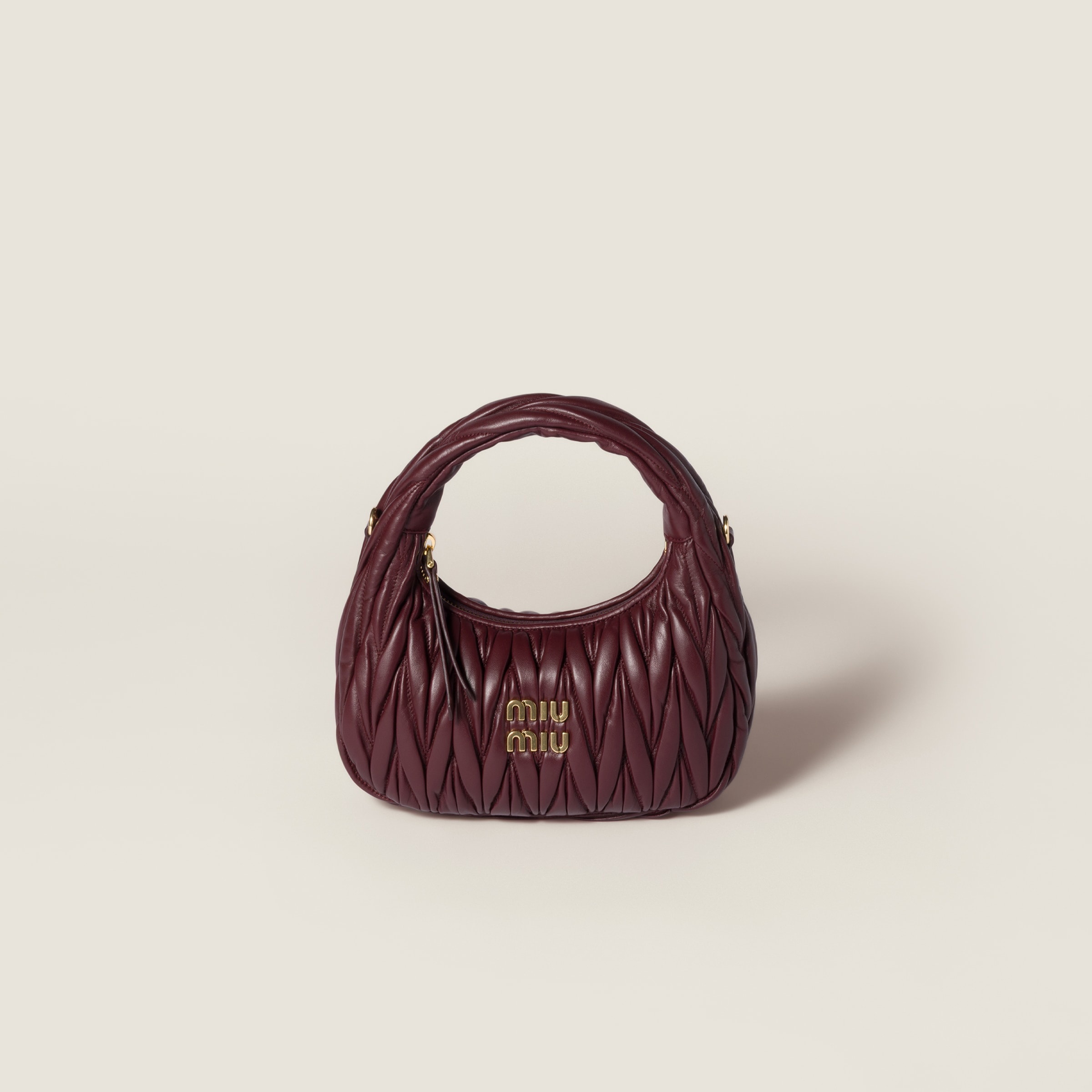 The Wander bag is reinterpreted season after season, becoming an iconic accessory of Miu Miu collections. Made of matelasse nappa leather, the bag is characterized by the sophisticated, three-dimensional effect created by the refined workmanship. The hobo shape, blending retro inspirations and contemporary elegance, becomes a new synonym of modern femininity. - Product code: 5BC125_AN88_F0007_V_OOY - Matelasse motif - Leather shoulder strap, length 110 cm - Gold-tone hardware - Metal lettering logo on the front - Zipper closure - Cotton satin lining - This bag can hold a phone 16 cm x 7.8 cm x 0.76 cm in size - The small Miu Miu wallet can be conveniently placed in this bag - Imported Height 17cm Width 20cm Length 6cm Materials Main material: Lambskin