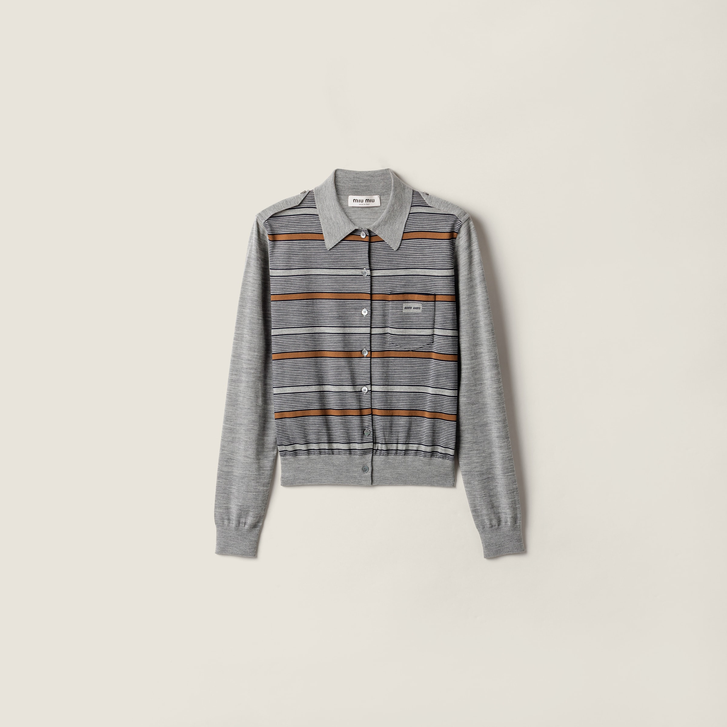 Seventies-inspired contrasting stripes define the refined, graphic character of this fine wool cardigan enriched with epaulets on the shoulders and the breast pocket with intarsia lettering logo. - Product code: MMF989_174D_F0031_S_OOO - Plain knit - Regular fit - Long sleeves - Regular shoulder - Ribbed knit cuffs and hem - Mother-of-pearl button closure on the front - Cuffs and bottom a knit - Front button closure. in mother-of-pearl - Epaulets with mother-of-pearl buttons on the shoulders - Intarsia logo on the front breast pocket - Imported - The model is 178 cm tall and wears a size 38 Height 58cm Materials Main material: 100% Virgin Wool