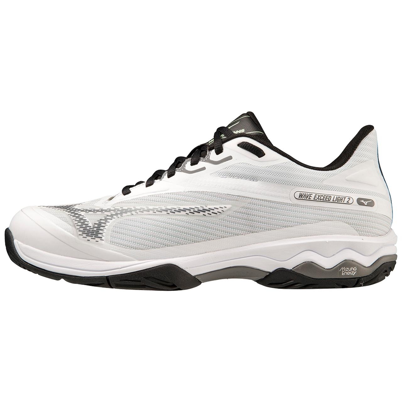 Designed for the active tennis or pickleball player, the WAVE EXCEED LIGHT 2 AC continues its tradition of offering the utmost in lightweight, cushioned comfort. No longer does a player need to choose between comfort and weight, as the Wave Exceed Light 2 is one of the lightest and most comfortable shoes on the market. Featuring MIZUNO ENERZY Foam and a unique MIZUNO FOAM WAVE plate in the midsole, the Wave Exceed Light 2 combines elevated energy return with a plush, yet supportive cushioning experience. A comfort last with a spacious width, along with an engineered mesh upper, combine to provide players of all levels with a premium level of comfort, flexibility and feel. - MIZUNO WAVE®: The MIZUNO WAVE® plate disperses energy from impact to a broader area providing a stable platform and a superior cushioning. - MIZUNO ENERZY (FOAM): Offering versatility in its application, while still maintaining softness and resilience.  It will help enhance performance capabilities. - POWNCE: An exceedingly lightweight mid sole material with excellent comfort and resilience properties. - Foam Wave: A Wave of comfort made of 2 layers of foam.  Top layer is U4icX and bottom layer Mizuno Enerzy - X10 Outsole: Durable carbon rubber that allows for longer wear. - U4icX Strobel Lasting Board: Ensures a comfortable underfoot feel. - Weight: 10.3 oz (Size 9)