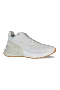 Alexander McQueen Oversize Runner sneakers. White leather. Beige suede insert. Logo on the counter and tongue. White mesh upper. White flat lace-up closure. White and beige oversized rubber sole. Round toe. Made in Italy.