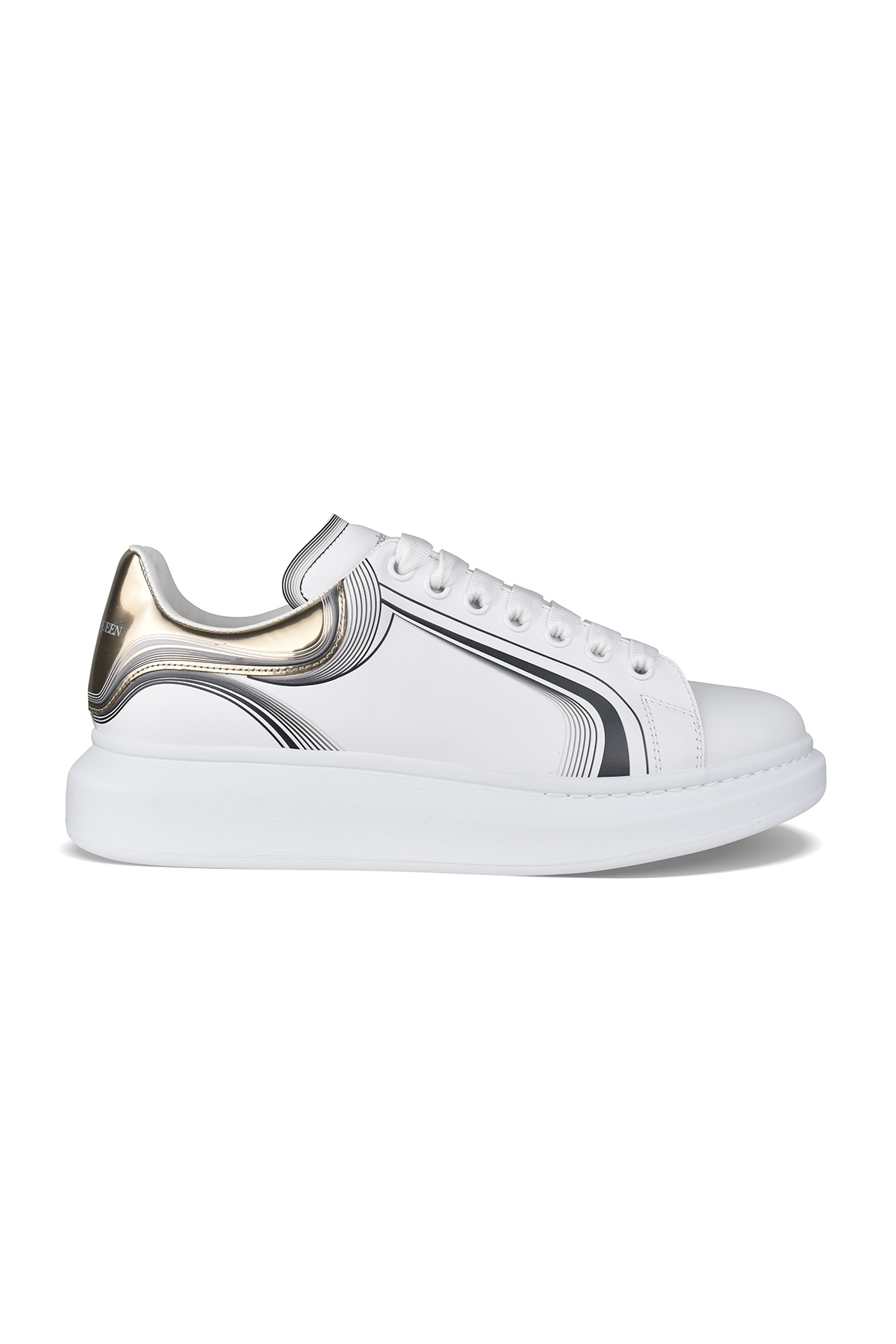 Alexander McQueen Oversize sneakers in smooth white calf leather. Shiny gold leather counter. Curve Tech print on sides, heel counter. Logo on counter and tongue. White flat laces. White oversize sole. 100% calf leather. Made in Italy.