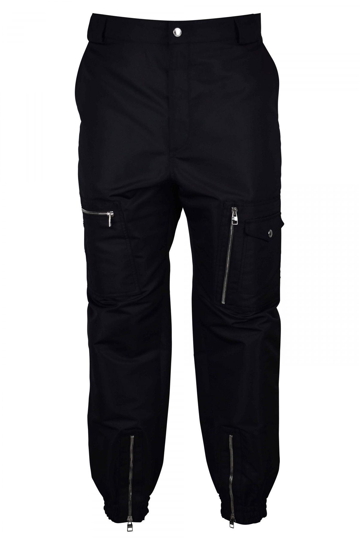 Black polyester pants Alexander McQueen. Cargo style. Two side pockets. Zippered pockets on the thighs and one with snap. Belt loops. Elastic ankles. Zippered ankle closures. Back pockets with snaps. Made in Italy.