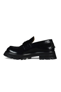 Alexander McQueen Seal loafers. Black leather. Embellished with a silver Seal patch. Round toe. Black oversized rubber sole. Made in Italy.