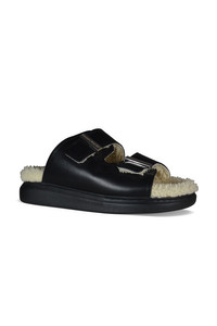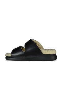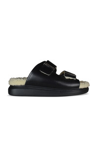 Alexander McQueen Shearling-lined slides. Black leather. Filled with beige sheepskin. Two straps with engraved metal plates. Silver finishes. Black rubber sole. Made in Italy.