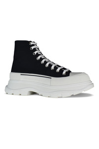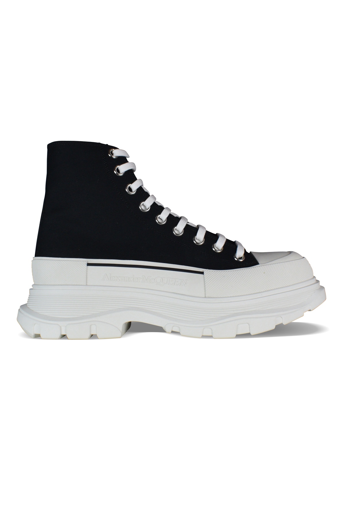 Alexander McQueen Tread Slick high sneakers. Black canvas. Round toe with rubber insert. Logo on heel and tongue. White flat lace-up closure. Oversized white rubber outsole with signature. Made in Italy.