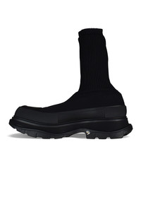 Alexander McQueen Tread Slick boots. Black ribbed sock-like knit. White contrast logo. Round toe with black rubber insert. Black oversized rubber sole with signature logo. Made in Italy.